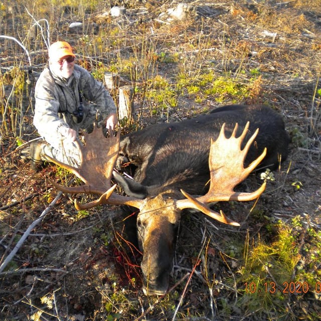 After a bit, we went to look for blood or a downed bull or something to confirm a hit. Nothing! How did I miss an animal that size? Bifocal problem? An unseen branch? An angel wing swinging down to knock away the bullet? I still do not know, but I know what I think. With no moose, we walked about 200 yards further into the cut and came over a rise. Bob said, “That is an old, big bull there, and we need to shoot him.” I took a similar rest and fired. He staggered and fell on the spot. As we approached, I am not sure who was more pleased. The pictures will speak for themselves. He was officially scored at 169 1/8" B&C.