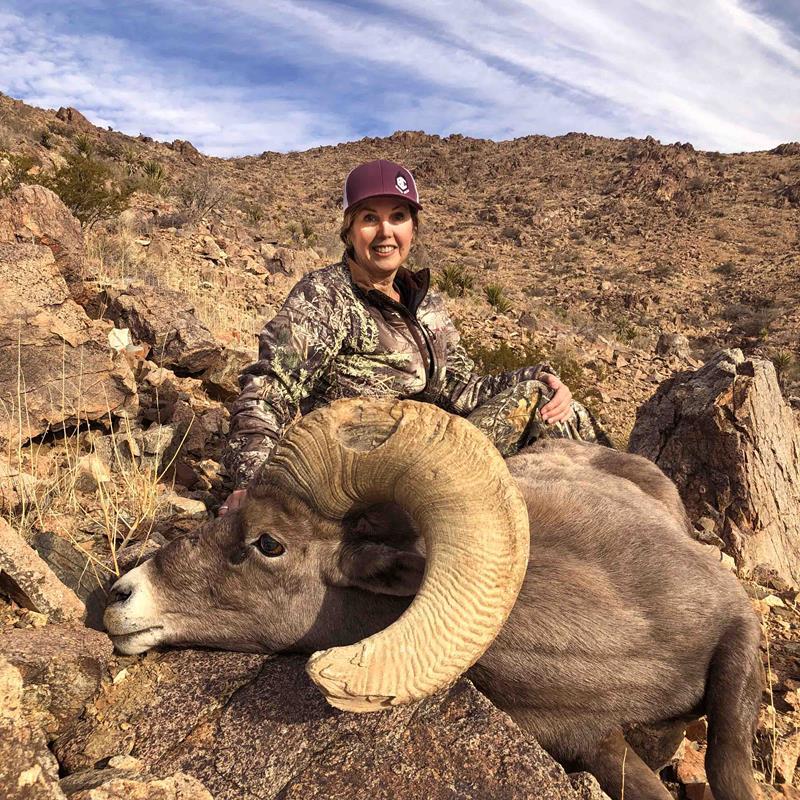 The wind was perfect for us, and we started slowly working up a wash to the base of where the incline started going up steeply towards the ridge. We were about 600 yards from the ridge when I got a message from my brother that the ram had gone over the ridge and they could no longer see him. He said it may be heading in our direction, so I kept looking up while we continued to move ahead. It wasn’t too long until I caught movement in a large section of rocks above us. I threw up the binos and immediately saw it was the ram. He was quickly working down through all the rocks. I whispered to Melisa to get down. We set up the shooting sticks, and she tried to get on the ram as he came down, but he was moving quickly and pinballing down the mountain. He would hold up for a few seconds and then continue down right towards us. He ended up about 115 yards from us and ran into a bit a brush in the ravine just above and to our left. I was worried that he had seen us move while she was trying to adjust the shooting tripod and her rifle to get on him. I thought he was going to blow out of the brush and run, but he ended up coming out and moving across the hillside to our left. I whispered that I would try and stop him, but I ended up saying, “Shoot him!” He was now so far to the left that she would not be able to shoot past me if he went any further as I was sitting to her immediate left. She was able to get on him and took the shot. The ram stumbled with a broken front shoulder and didn’t go far. He turned a bit, and I saw the exit wound. I knew he was hit hard, and then it was over as he fell.