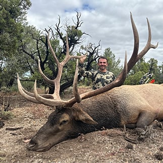 What happened next was something out of all of our dreams. A giant set of antlers sideways, almost upside down to squeeze in between the junipers moving right into my shooting lane. At full draw I placed my pin center of the vitals and then began to assess the bull. Starting with the basics six points on each side, yes. Pot belly, yes. Then the bull erupted again and I got a good look at his brow. It was him. I recentered my pin and started my shot sequence. The arrow was sent, and it hit home. I heard the bull die inside of a hundred yards. In complete disbelief, I followed the blood. I couldn't fathom what had happened. When I’d first laid eyes on the bull, I knew he was big but still didn't really realize just how big he was.