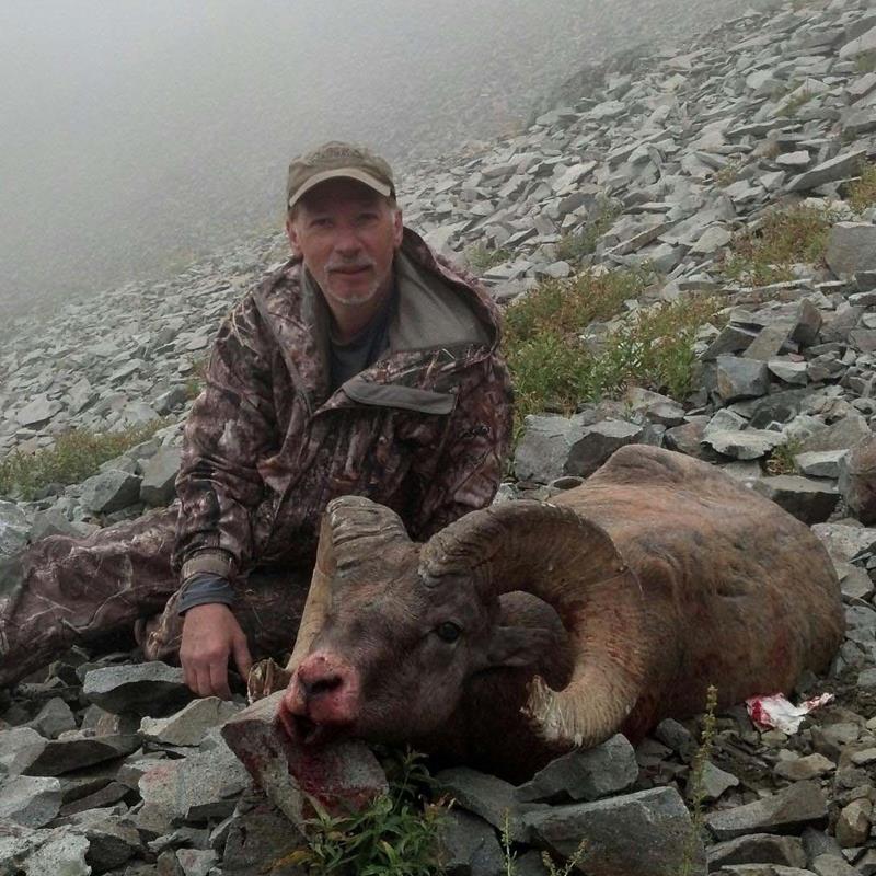 Tying the horses up in a small group of alpine fir trees, we proceeded on foot climbing toward a high basin where the group of rams had been spotted several days prior. We spotted a mule deer buck and two does feeding to our left. Almost simultaneously, to our right we heard rocks falling from an incredibly steep rock ridge partially engulfed in fog. Finally, we spotted the group of 12 good rams near the ridgetop. Four of the rams crossed the top of the ridge, while the remaining eight rams stopped and stood on a rock bluff. They were mostly gazing back toward the mule deer and paying less attention to us. This allowed us time to settle behind some rocks in the meadow. The largest of the rams JJ estimated at 165"+ had heavy bases and was nicely broomed. We ranged the rams at 476 yards and debated the possibility of attempting a shot.