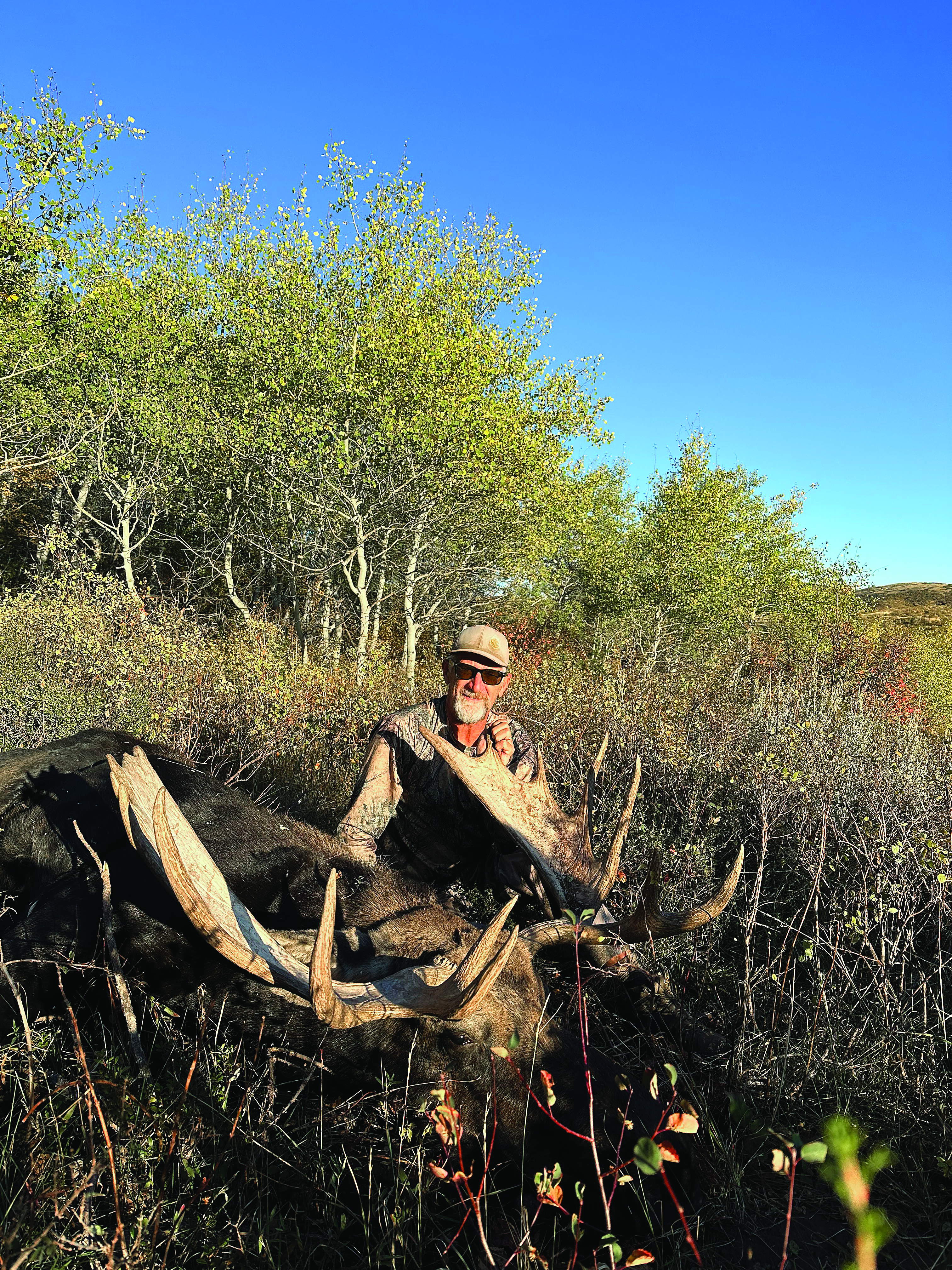 Once again, I didn’t make it to the top. About a quarter mile from where I had seen the spike, I again saw something black a first light. It was a cow moose feeding on a hillside below some small aspen stands. As I was watching her and wondering if anything else was around, she trotted off a bit and then slowed down and started feeding. As I was watching her feed, I thought, did I just hear a bull grunting? Then it happened again. I looked back at the aspen stand, and the bull slowly walked out, still grunting. He was at a 90-degree angle to me, so I could not completely see his rack, but it looked good to me so far. He slowly walked and then turned his head towards me enough that I could see he was wide and a plenty good bull for me. I was sitting down and watching him through my scope. He was 175 yards away and broadside. I held for a high shoulder shot with my 7 Mag. At the shot, I saw him collapse. I couldn’t believe it had happened so fast!