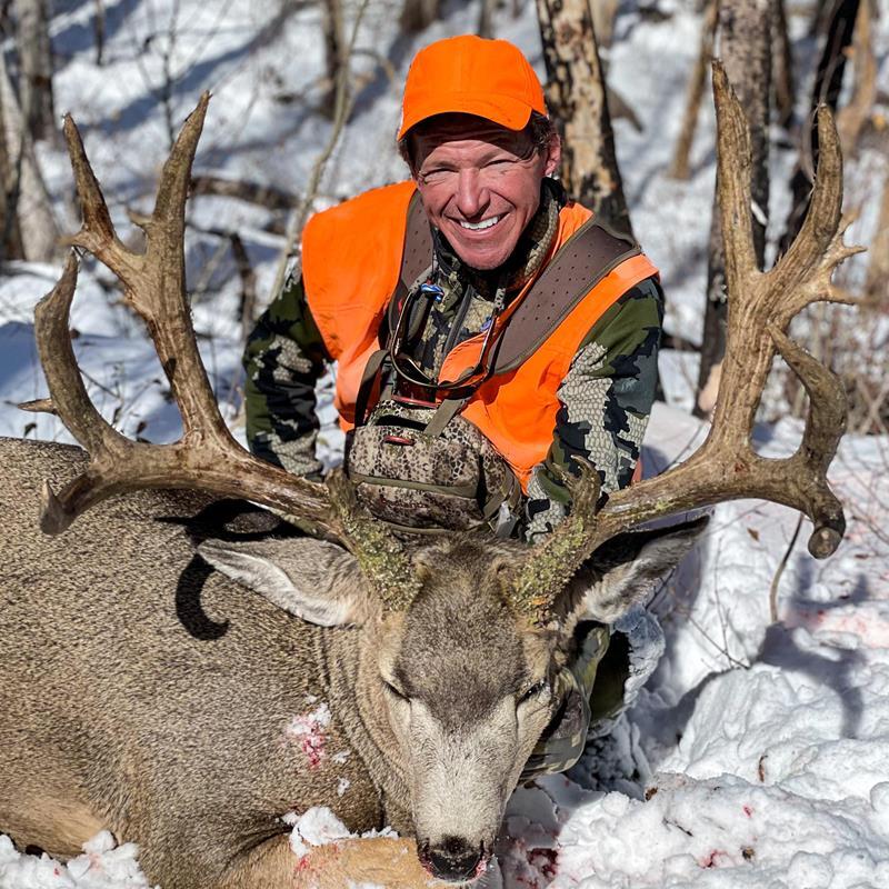 Southern Utah mule deer. We started seeing mule deer as we moved between various peaks. Jake explained that he had spotted one of the biggest bucks he had ever seen in Utah the day before around 11 a.m., and if we didn’t see a shooter that evening, we would try for the big boy the following morning, which is the plan we ultimately went with.The following morning, now day three, was blue skies, gorgeous and perfect for glassing. We split into two hunting parties, with me joining Jake hopping from peak to peak. I had brought my trusty, lightweight Christensen bolt action rifle in .280 Ackley Improved mounted with a Carl Zeiss Victory V8 scope, which allowed me to (mostly) keep up with the surefooted peak hopper, Jake. We saw a reasonable 3x4 shooter the night before and spotted him again that morning around 900 yards from one of the peaks we glassed from. Only this time, we saw that he had picked up as a companion that morning an absolutely monstrous buck trailing behind. Jake asked a key question as the pair was moving between 700-900 yards from us across a valley for an hour, “How far can you shoot that gun?”As we were discussing long-distance drops, I realized my phone had service on that peak and I did something I’ve never done in the field in my life. I called John LaSala at Safari Arms Ltd, who has custom loaded my ammunition for a decade and posed the question to him. His answer with those 150 grain Barnes at 9,000 feet at 900 yards zeroed at 200 yards was initially “a lot” (with a New York chuckle) followed by specific drops for my needed calculations between 700-900 yards.Over the next two hours, Jake and I ascended and descended multiple rocky and burned evergreen mountaintops to try and keep up with the pair of mule deer that were feeding their way to our right. The great question became which lower valley they would ultimately choose to drop into in their journey. Jake made the call for us to wait on a rocky ridge amongst some dead trees so we were protected from their line of sight but also couldn’t get winded. Luck was with us as they came down the cut in the mountain where we were waiting. Jake spotted the 3x4 to our left, and sure enough, that monster was behind him, slowly eating his way down the hillside in front of us. Jake advised me to turn my riflescope down and told me to prepare for a shot inside of 75 yards. (The final shot ended up being 55 yards.)The “toad” of a mulie made his way in front of us, but any clear shot was blocked by elevation changes, snowpack, and burned trees. We waited. My heart raced. I was now calculating where to aim for a 50-yard shot vs. 900. The mulie stopped between some trees and brush and gave me a couple of seconds delay in his stride to pull the trigger. Boom! I lifted my head off the scope, and the buck was just looking at me. Had I missed? Bumped scope? Did the murk and gloom of 2021 follow me into the mountains as well? Then Jake’s calming voice came, “Put another in him.” I focused on the reticle, put the crosshairs on his shoulder, and let another 150-grain bullet fly. This time, he rolled onto the ground for good.As we walked through the snow and got a closer look at this absolute beast of a mule deer, the personal darkness of my 2021 faded completely. I had hit him twice, and this was the biggest deer of my life, scoring 217" in a drought year! Jake is an absolute master at his craft. Thank you, Bess Family and Huntin’ Fool, for showing me some much-needed luck!
