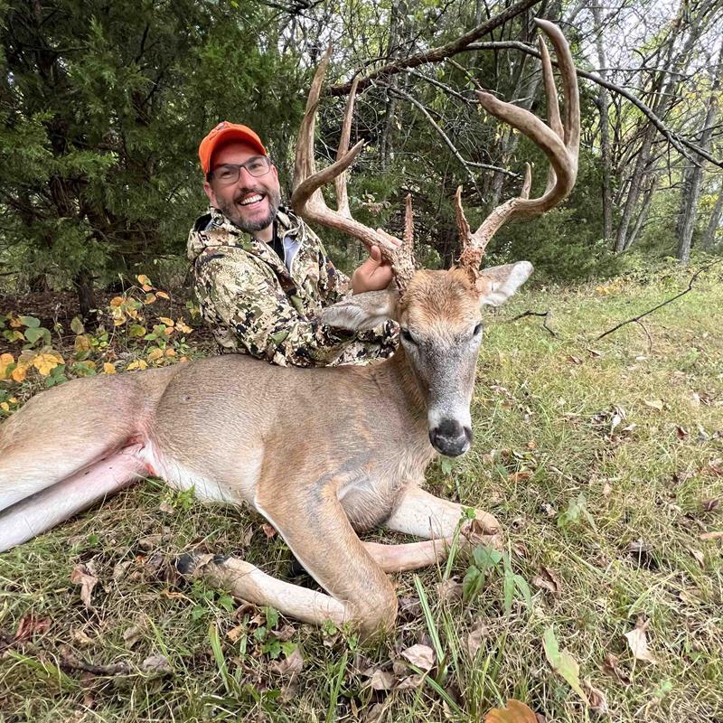 No blood. Deer trails were everywhere. We spread out. Clint Walker, one of our guides, crossed the creek and asked me to come over to where he was. Whitney, our head guide, said she was headed way down along the creek where she saw some crows. Clint started laughing, saying she should hold up a minute. Worried and stressed, I walked over to Clint. He took a blade of grass from his teeth and pointed with a huge grin on his face. My deer was not 75 yards from where I made the shot. He was still warm and movable. I had hit further back in the liver, and he had been watching us look for him the night before. I jumped for joy, said a prayer of thanks to God, and grabbed a hold of my best whitetail!
