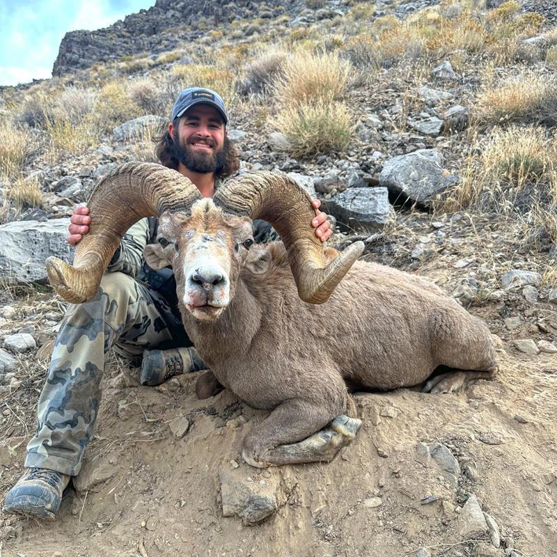 My brothers and I loaded up our packs and started the hike. The ram was initially 1,000 yards away and crested over a mountain, so we knew we had to get up there to have a chance. We walked across a flat in speed walk fashion, got to the mountain’s base, and climbed up a very steep face for what seemed like hours when it was only 45 minutes. We walked up the spine to where he went over, expecting him to be at the top, but to our surprise, he was not there. We glassed all over the other side, which was a huge canyon/basin. Tony noticed a group of beds below us, about 80 yards, that were very fresh and even had some urine in the dirt, so we knew he was close. After being up there for 20 minutes, Dom found him. He was 880 yards away, bedded with nine ewes around him. He had gone up and down the other side in some nasty, steep terrain.
