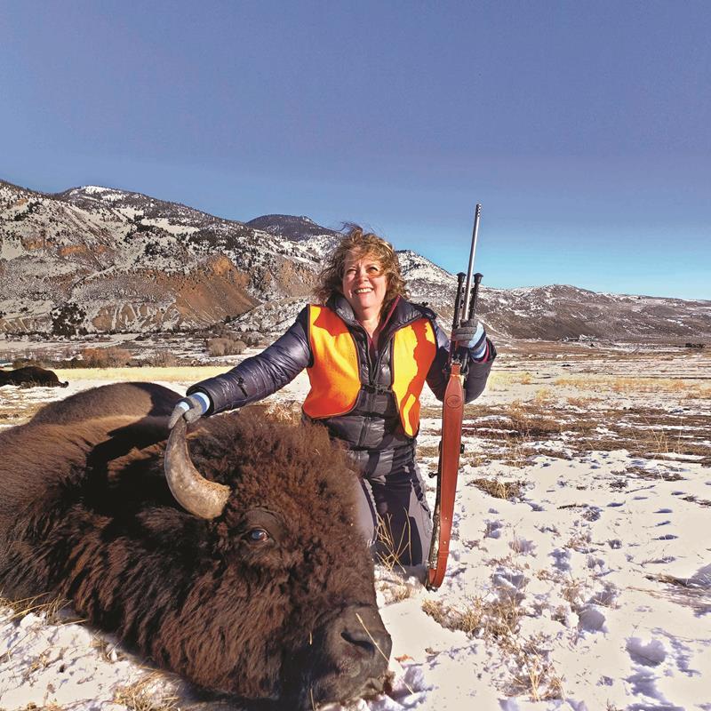 To say that I’m not a hunter would be an understatement. In fact, my sister jokingly said to me recently, “Who are you?” Well, 30 years of being married to a Huntin’ Fool will do that to a girl, I suppose. Don’t get me wrong, I have enjoyed raising my kids on wild game and have begrudgingly allowed my husband to fill up much of our house with animal heads, not because I love them, but because I love him. Therefore, I was somewhat surprised when Montana Fish, Wildlife, and Parks called me in the beginning of February to tell me I had drawn an either-sex bison tag for the Gardiner district. My husband had received a few calls like this over the years, but none had been for me. Unbeknownst to me, my husband had been putting me in this draw for many years, so I was slightly confused and didn’t react as much as they were probably used to hearing to this kind of hunting gold. At the time, I didn’t really understand that I had the next two weeks to harvest the animal, not just buy the tag. I understood later that they had activated the Bison Hunt Roster due to the large number of bison leaving Yellowstone Park this year. I was one of 20 people to get a tag and had until February 15th to fill it.My son had drawn a regular season tag for the same district five or six years ago and had hunted in late November, so I was expecting the same; however, I decided pretty quickly that I wanted to try. When my husband arrived home from work a few hours later, I initially forgot to tell him about the call, but when I told him about it, his eyes about popped out of his head and he jumped up to call his good friend, Olaf. They were both very excited. My son, Jack, was able to harvest a small, young bull after much hard work, and my husband had killed a nice bull 20 years ago in the Henry Mountains of Utah. We had very much enjoyed the meat, and I looked forward to being the one to possibly fill the freezer this time.Growing up on the foothills of the Wasatch Range in Utah, I had many opportunities to shoot guns. My father had raised all of his eight children with a knowledge of firearms. He believed it was important for us to know how to shoot. I have fond memories of shooting with him and my siblings, but there’s only one picture of me shooting with my dad that I cherish. I was 11 or 12 years old. He is standing close behind me so that the recoil doesn’t land me on my rear. You can see how happy he is in that picture.Barry, my husband, and I have continued to target practice and clay pigeon shoot over the years with our boys and their friends, but I had never killed anything bigger than a spider, so I was a little worried that I would make a bad shot and just wound the animal so that it would suffer needlessly. A few days later at the range, we set up a target at 100 yards and I shot a box of shells. I must admit it was a lot of fun, and I was able to shoot a decent-sized grouping. For a short moment at the range, I felt as if my father was there with me practicing. I knew he would be pleased with the prospect of my upcoming hunt.The following day, we were on the road to Gardiner with our good friends, Trish and Olaf. I was to learn quite quickly after the kill how gigantic bison are, and there was no way we could have dressed this animal on our own. I am very grateful for their help and friendship.When we arrived at the hunting area outside of Gardiner, just north of Yellowstone Park, we saw hundreds, maybe even a thousand, bison outside of the park. They were standing and foraging in fields of private property posted with no hunting. We also saw a lot of gut piles on adjacent land managed by the U.S. Forest Service. Barry was shocked as this was not the situation when he had brought our son here years ago for his hunt. Immediately, we were very hopeful!Multiple Native American Tribes conduct tribal hunts in this same area each winter. They are only subject to the tribal laws, so they can shoot multiple bison and tag them for friends and family. We met a group of Native Americans from Idaho who were very friendly and filled us in on their hunt thus far. They had harvested several bison already that they were taking back to family members on their reservation. They explained that we would not have to wait long to fill our tag and invited us to be part of their group.Within 15 minutes of this conversation, we could see a group of bison forming to our north and getting ready to cross over into a huntable area approximately half a mile away on Forest Service property. We quickly got down there and followed the small herd of approximately six or seven large bulls quite calmly. When they crossed the necessary property lines, we coordinated with the other hunters and each chose a specific animal. They let me pick a big bull at the tail end of the group. When we were about 100 yards from the herd, we all took aim and one of them counted, “One, two, three!” and everyone shot together. I aimed right where his head connected to his neck. Several bison dropped, mine included. After some follow-up shots, six bison were down. My fellow hunters let out a war whoop, and I said a silent prayer of thanks. When we approached my bull, we were all amazed at his size! I thought I might be a little sad, but I wasn’t. All I felt was gratitude and joy. I thanked the bison for his life and told him he was going to feed our families. Olaf and Barry were thrilled and proud of me. Olaf said, “It’s pretty remarkable that Nancy’s first big game animal is a trophy bison!”A friend asked me afterwards if I now considered myself a hunter. I paused for a moment and said, “Not really. I’m happy to let Barry provide for the family.” Although I will likely never be an avid hunter, this was a great experience and one that I would definitely do again.