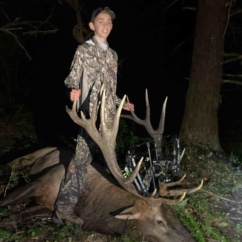 gotten a trail cam picture of a giant. That had got me ecstatic for opening morning, but I didn’t let my hopes get too high because years in the past, we had gotten pictures of bulls and they never came back or were seen during season.We woke up the next morning and were off. We made it the 350 miles without any issues to the horse camp. We set up camp and went to clear trails and set up our ground blind. When we checked the trail cameras, his herd was there last night, but he wasn’t anywhere to be seen. That would be one of the longest nights I’d ever experience.Excitement was high on opening day as we took off for the spot to beat everyone else there. We sat in the truck for the next two and a half hours until half an hour before shooting light. We would slip into the trees and wait at a trail intersection until shooting light and then we would go a little further in and wait. We knew the elk would cross if they were coming out of the field. They never came, so we walked the trails for a while but never did see anything. We went back to the truck and drove for a couple hours. We then went back to camp to rest for the evening hunt. We slipped into the ground blind and waited until dark but not see or hear a single elk. It was fun but disappointing for my first ever day of archery elk.On day two, my hopes were high, but I had developed big puss-filled blisters. We couldn’t think of anything that would do that, so after the morning hunt, we ran into town to go to a MultiCare. We did the same thing as the first day. We got to our spot and waited until half an hour before shooting light. We slipped into the trails and waited at the crossing. After that, we walked into a section of open timber with ferns where the elk tended to hang out in the mornings. After walking through that and not seeing any elk or any fresh sign, we went back to get ready to go to the doctor. When we got there, it turned out I had a reaction to some poison oak.That night, my uncle was hunting the field and we decided to hunt outside of camp. We knew there were some elk around camp because we could hear some cow calls at night. We got on the horse trails and started cow calling and bugling here and there. However, we never got anything to call back. After we got back to camp, about 15 minutes later, my uncle pulled in saying he had shot a cow. Day two was disappointing, but we knew bulls could show up at any time.Instead of waking up at 3:30, we woke up at 5:00. When we got to the spot, there was no one there. When daylight came, we were on the trail and going to the field where we had hunted during the evenings and saw our first elk of the trip, but it was just a cow and calf. We slipped back into the trees, walked back to the truck, and went to another spot.We started to walk some logging roads that led us to a meadow overlooking a river with a bunch of blackberries. After a little bit of walking, we jumped a black bear. We almost got a shot at it, but it noticed us and took off. We went back to the truck to go back to camp to prepare for the evening hunt. When I got back, it was time for me to take a nap.Two hours later, we were getting ready to leave for the evening hunt. We got in the blind, and 45 minutes later, a kid started playing over 300 yards away and was super loud. I was thinking the evening hunt was done, but they eventually went inside. Then we started hearing cow calling. My dad and I thought there were people hunting the fence line. A cow and a calf came into view from the right side of the blind, and my dad said the big bull was with her. I stuck my head over a little bit, and when I saw him, my heart started beating super fast. I grabbed my bow and started to draw. The cow and calf took off, but the bull didn’t. I let it go and got scared because as soon it went in, the arrow broke. We thought I had heart punched him, though. He ran but stopped at the fence, carrying his shoulder. We knew he was hurting, so we slipped out of the blind. We got 40 yards from the blind, and the bull jumped up. At the same, I realized that I forgot my quiver in the blind. I walked up to the part of the arrow that broke off and compared it to another arrow. I was missing about a foot of arrow. That made me feel much better about the shot.We walked back to the truck, and when we got there, I called my uncle who had shot a cow the night before in the same blind. Then I called my mom to tell her. By then, it had been about an hour, so we drove back to begin the search. We walked to the fence, and there was good blood. As we kept going, he really started bleeding.However, he had crossed the blood trail of the cow, so we were trying to find where he was going. Eventually, we found our trail, but when we got into the timber, it was just drops and we were struggling to find blood. My other uncle, Scott, found blood again, and then we heard something kicking up in front of us at 100 yards. We moved quietly, and there he lay. This was the biggest bull that any of us had seen in that area, and both my dad and Scott grew up hunting up there.We took a lot of pictures but had bad lighting. All of it was from headlamps. It was surreal being 14 years old and killing a bull that I may never top. We had him quartered out in about an hour. The pack wasn’t that bad with the meat. The head was a whole different story because we put it on a pack instead of carrying it. With all the low-hanging branches, it would have been easier to carry. However, we got everything done with no issues. At 14 years old, I killed a bull with a gross score of 333.4" and 328.4" P&Y.