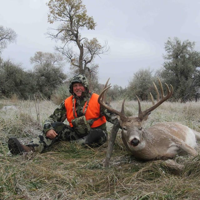During the 2022 season, I was watching for a decent 5x5 that I had seen in velvet in summer. I saw him a few times but never had an opportunity on him during legal shooting hours. Come February 2023, he showed up on my coyote cams with a broken left side. I searched for him all summer of 2023 with no luck. I saw nothing worthy of buying a tag and was disappointed. Then about three weeks before the rifle season opened, I saw a big rack with the “Wow!” factor sparring with another buck in the high grass and Russian olives. Through the scope, I knew it was him.That night, I got online and bought my tag. I saw him a couple times again feeding on a red clover and alfalfa field right at dark. I was pumped at the opportunity. He dwarfed all the other little bucks.Opening morning was Saturday, and I set up on that field an hour before shooting light with just a doe, some yearlings, and a one and a two-year-old buck to be seen. I heard three distant rifle shots that morning, hopeful he wasn’t on the end of any of them.Opening afternoon, I again set up on the same field in an elevated deer blind with the same deer coming out of their bedding areas an hour before dark. The old doe and her buckling fawn walked below the blind and looked up right at me before snorting and quickly moving off. I came to the conclusion that the blind was too close to their bedding and feeding areas and didn’t want to blow this opportunity by trying to sneak out there again.Sunday, I gave it a rest to watch football but checked the field just before dark and only saw that old doe and three yearlings. The weather was starting to change and was going to get cold and snowy.Monday evening after feeding livestock, I checked the field at sunset. There he was grazing. I scrambled to get my rifle and my orange and bino harness on and hustled to get to a nice perch on top of one of our haystacks about 300 yards from him. According to the chart, I had 15 minutes of shooting time left. I hesitated because I couldn’t get steady enough and it was a bit too dark with the cloud cover. I climbed back down the ladders and had regrets but hoped he would be back again the next day.On Tuesday, it was cold and spitting snow all day. I figured the buck might get out early, so I did chores and checked the field at 1730 hours and there he was. Shooting light ended at 1844. I had time to get back up on the hay bales and was looking at him through the scope at 200 yards by 1755. I was calm, solid, and prone, and at 1810, I shot. It was a loud “Whack!” and he ran about 50 yards toward the trees and stopped, quartering away. Without a spotter, I had no idea where I hit him, so with another round in the chamber, I let it fly. Another loud “Whack!” and he ran off the field and into the trees and brush. I tried to locate him from the perch as it got darker but to no avail.Without disturbing the other deer, I backed out, went to the house, and wondered where I would find him the next morning. After feeding and milking, I jumped in the Ranger and it didn’t take long. The shots were good, and he was not 40 yards from where he went into the trees. I got the camera on the tripod and tried to take some photos to do justice to this nice