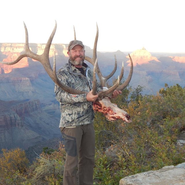 When we could finally move forward, the elk had faded into the forest and completely out of sight. The bull had stopped bugling, and a helpless feeling came over me that the monster bull elk of my life had just slipped away. Hunter slowly worked us in the direction he had last seen the bull. We made our way along the north side of a small ridge. Hunter was glassing to the left down the ridge, and I was right behind him. It was then by crazy luck that I picked up the head of a cow elk about 40 yards straight ahead of us. I tapped on Hunter’s back and whispered her location as he slowly swung his binos in that direction. He whispered that the bull was lying right next to her. I slowly got my rifle ready for the shot. The bull lifted his nose and swung his head as if he had caught our scent, but this allowed Hunter to clearly identify the bull’s large G2s. Hunter stuck out his left shoulder, cocked his head to one side, and covered his ears. In a split second, I rested my muzzleloader on his shoulder and took the shot. Through a cloud of black powder smoke and the smell of sulfur, we saw the bull jump up and he was quickly out of sight. As he ran, he gave out a deep bellow and we knew he was hit hard. We waited about 30 minutes and found the bull 60 yards away. It had been a double lung shot, and the bull didn’t travel far before quickly dying. He green scored 383", but more important to me was the sacred experience of hunting such a tremendous trophy.