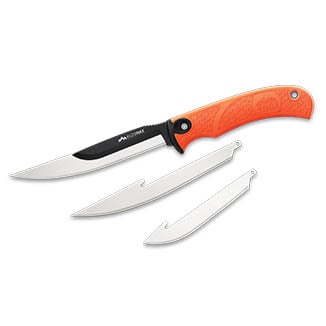 Outdoor Edge once again raises the bar with the RazorBoneTM. This knife merges big blade performance with folding knife convenience in a compact, lightweight multi-blade set to bring your game from the field to the freezer and everything in between. Three different blade styles work in unison to field dress, skin, debone, and prepare fresh venison into family size portions. The RazorBoneTM includes three 3.5" drop-point blades, two 5.0" boning/fillet blades plus the new gutting blade to open game like a zipper without piercing vital organs. All replaceable blades are constructed from Japanese 420J2 stainless steel and individually vacuum sealed to protect them from the elements while keeping them razor sharp until the moment of truth arrives. The structured nylon sheath features a divider to store extra blades and houses a blade storage box to pack out all three blades once the job is complete. Make the Cut
