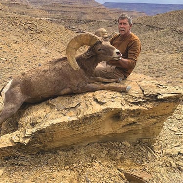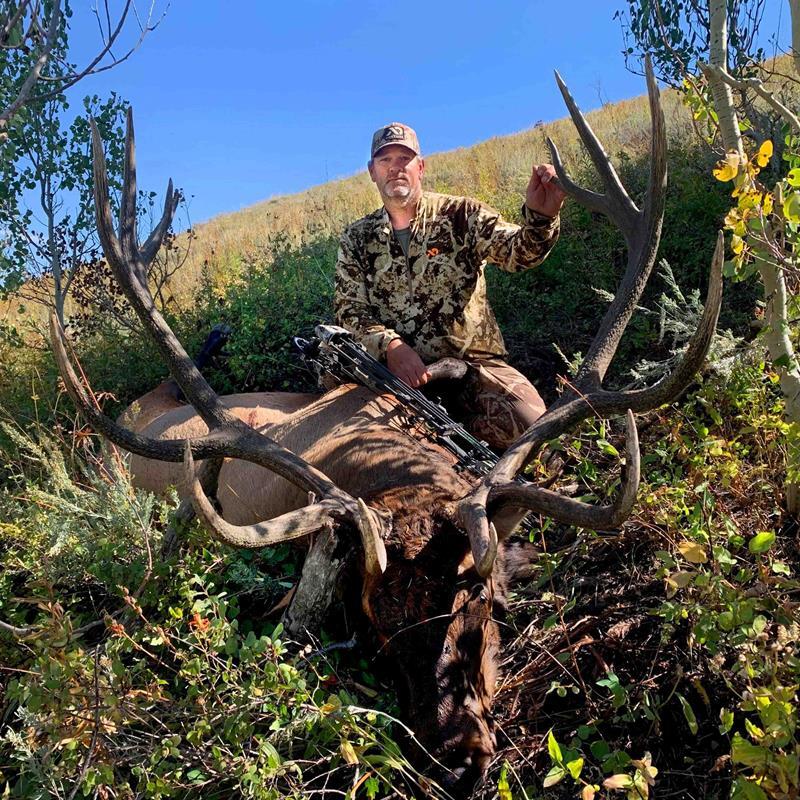 After about 15 minutes, I caught movement. The 7x7 bull was coming from the right side over to the left side to scream at another bull in the bottom. I took my pack off as I was laying down and started crawling in the sagebrush to get to the top of the ridge so I could cross over to the other side and get out of sight. I worked down the ridge on the opposite side of him, hoping not to encounter any of the cows. I was able to work my way down about 60 yards when I heard a bugle that I could tell was close. Then I saw tines starting to come over the ridge, so I squatted down behind some brush and a couple boulders. I was about 70 yards away when he came over. He stood there bugling in plain sight. All of a sudden, he turned and started walking towards me. There was a small depression in between the bull and me that once he went in, I could see only tips of antlers but not him. My arrow was nocked, and I had good range markers. As he got to 40 yards, he stopped and let out a bugle. The bull off the other side bugled back and made him turn his head enough that I could come to full draw. I took a deep breath and let one fly. He turned 180 degrees and ran about 40 yards over the ridge. I hurried to the top and watched him go about 80 yards down the open ridge and stop. I nocked another arrow because I could see blood on his side. He then walked his way down another 60 yards and bedded on the open hillside. I knew he was hit hard.