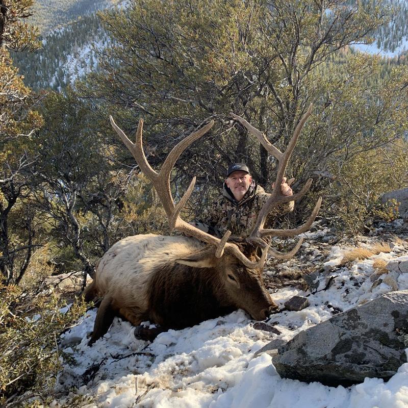 Opening day arrived, and I soon witnessed the quality of this hunt and the opportunity that it possessed. By the end of day one, I had passed several 340-350" bulls, hoping for something bigger with this 10-day hunt. Never before had I been on a hunt and felt comfortable passing bulls of this size. The quality of this unit was amazing even in a down year. On day three, we had 10 inches of snow, which aided our hunt considerably. The evening of day three, we located my target bull, a large bull that had a busted beam after his fourth. The mass, length, and sheer size of this bull was amazing. He was 380" if he was intact. However, we were unable to make a move on the bull that evening because of low light and his location at the top of the mountain range.