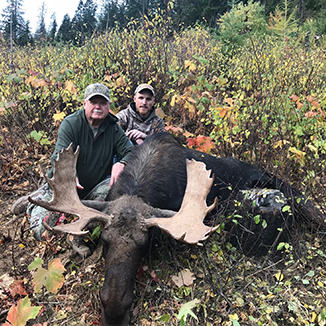 We pulled up to a split in the road to check out a logged out area below us. As we walked up one of the roads, we saw two young bulls sparring across the canyon. Another cow and calf were nearby. Everyone’s adrenalin was pumping. Linda, after hearing a crunch below, motioned to Eric. He let out a couple of cow calls. At that moment, a bull grunted back. The bull came into view following a big cow. What a beautiful animal he was with black fur glistening in the sunlight. I asked Eric what he thought, and without hesitation, I heard, “You need to shoot that bull!” I finally sat down, offering an open shot, and set up my Bog-Pod. The 238-yard shot with my .300 WSM was made with the moose falling out of sight in the underbrush.