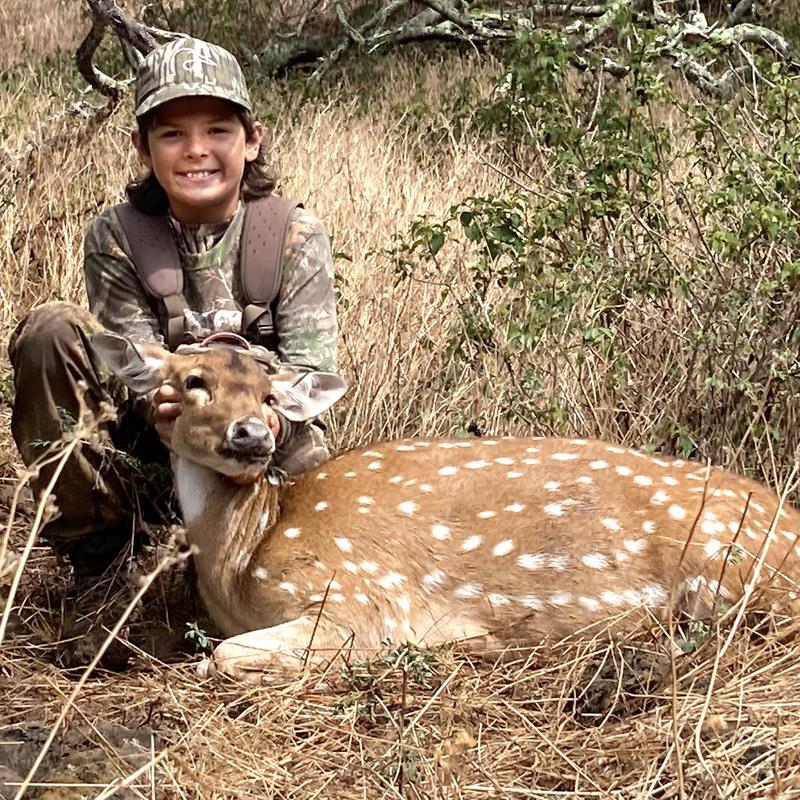We then went to a spot where there’s always axis deer. When we got there, there were only a few deer, not a single buck. We went back to the camp and went to bed. We woke up early the next morning and went to a new spot where we saw a small buck. We decided not to shoot it so it could grow for a while to get bigger for another hunter. We called the head guide to see if it was okay if I got a doe first because you are supposed to get a buck first and then a doe. Since it was my first deer, the boss said I could.