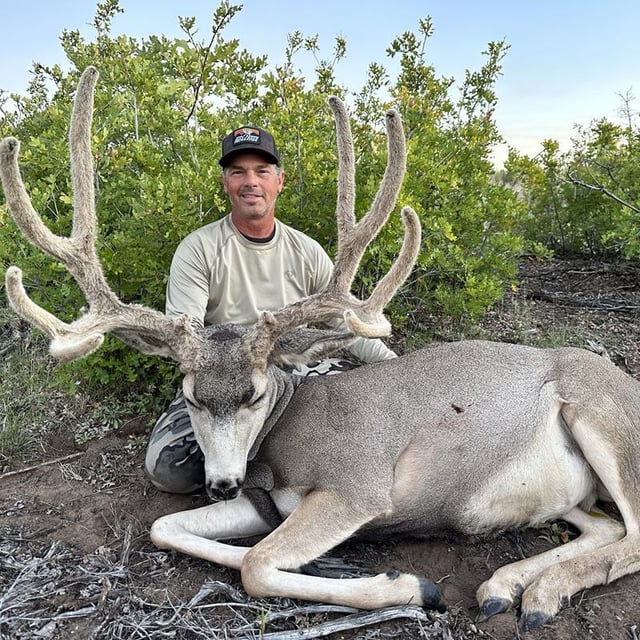 came out, I was totally shocked with the “SUCCESSFUL” notice that I had drawn the Paunsaugunt muzzleloader buck deer hunt. Although I had 19 points going in, that was not even close to being enough to force the draw and I had drawn the one and only non-resident random tag. Realizing the rare opportunity I had and being limited on time, I felt the only option that made sense was to keep the tag and hire an outfitter. I spent the next day and a half speaking with outfitters and felt best with Travis Roundy of Deerbedead Outfitters.There were many hours spent on the range getting the muzzleloader dialed in for this hunt. When August rolled around, my buddy, Aaron, and I were able to make a trip into the unit for a three-day scouting trip. Aaron would also join me for the hunt. Even though I had an outfitter, I wanted to at least know my way around to experience this opportunity the best I could. We drove the roads, looked over a lot of country, and even found some very good bucks. We stopped by Travis Roundy’s taxidermy shop to meet and speak with him, and it certainly left me feeling I had the right guy for the job.It was now late September, and we were headed to Southern Utah. We arrived a couple days before the hunt. Travis wanted me to have a chance to set up camp, shoot the muzzleloader, and look over some deer before opening day. This had been an exceptionally wet year, and we had high expectations of hunting large antlered deer. Travis knew of a couple big bucks that he had scouted during the summer, and I obviously wanted to go after the biggest one he knew of. I was warned it would not be easy and we would not see many deer where this buck lived, but if I was OK with that, it was definitely the one to focus on. That sounded like it was right up my alley, and I was all in.It was now opening morning, and we had already glassed up our target buck in the first hour of the hunt. He had large, bright red antlers and appeared to have just shed his velvet during the night. He was a long ways out, and we only got to look at him for a few seconds as he made his way through the thick oaks and over the ridge. We would not see that buck again for several days. Travis, his son, McClain, Aaron, and I spent day after day glassing for that buck. Those were some very long, tough days trying to relocate that deer. One particularly tough day, we didn’t even see a single deer. Having laid eyes on the giant that first day was enough to keep all of us focused on relocating him.The morning of day five, we had relocated the buck and found he had moved about a mile from the last place we had seen him and was now living on a part of the mountain that was not visible from any of the vantage points we were using. I was finally putting my first stalk on this buck. At 550 yards, we watched him go over a small ridge. We felt we knew where he would bed and waited him out for the rest of the day. When he finally showed himself, it was too dark for a shot.We continued to hunt hard for that buck through the final morning of the hunt without luck. We did find him a couple more times but were not able to get in close enough. At 1,200 yards, we watched him for our last time go into the thick trees. The final half day of the hunt, we got very aggressive moving from vantage point to vantage point, trying to turn up something big. As we entered the final hour of this very coveted hunt, we finally caught a lucky break and found a large 4-point buck feeding through the oaks. We were able to get in for the shot, and with only 40 minutes left in the season, this hunt finally had the perfect ending. This deep forked 4x4 was still in full velvet, which was unusually late. This was a buck McClain recognized from summer scouting but hadn’t seen in over 30 days. Although we did not end up with the target buck, it was still very satisfying hunting a giant the whole season and still coming out with a solid trophy buck.It always seems to hold true that no matter how good of a tag you have, it always ends up being a hunt. Don’t ever expect it’s going to be easy just because it’s a great tag. This hunt had some very mentally tough days, but I was lucky to have the team I had and we never let it get to us. I really owe it to Travis, McClain, and my buddy, Aaron, for working hard all the way to the very end. These guys wanted a big buck just as bad as I did, and their work ethics are top notch. I’d also like to mention the friendships made and the fun we had that made this an unforgettable experience. The buck green scored 195 2/8" gross and will make a beautiful mount with velvet intact.