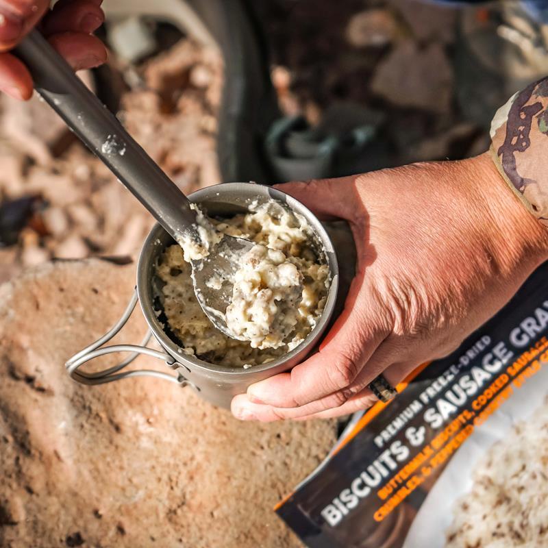 “Finally! I'd say fairly confidently that collectively here in the office we have ditched other brands completely. Throughout the year with hundreds of hours in the field, our Hunt Advisors trust Peak in their packs. Biscuits and gravy was the final tie to cut loose the missing link, if you will. This creamy, wholesome goodness is something I know we have been wishing for since Peak launched. They knocked it out of the park when it comes to flavor, and who's going to complain about a hearty home-cooked meal on the mountain, especially when it boasts over 1,000 calories per pouch? A few tips based off our trials, be sure to crumble up the biscuit. Make sure to get it into small bite-size pieces before cooking. Second, you can get away with less water. In fact, if you like less runny gravy, it's a must. The recommended amount will provide a tasty meal, but for me personally, I could get away with only 8 oz. Get your hands on some Peak Refuel! We have ordered our fair share.” – Stanton Upson, Hunt Advisor