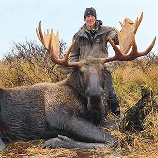 We watched the bull rub willow brush and tend to his cows. Following the edge of the swamp was going to be a challenge, but it was our only way of covering our approach. We got 500 yards downwind of the secluded willows and quickly picked up the two cows, but the big bull was nowhere to be seen. We decided to belly crawl another 200 yards closer and hoped for a better view of the animals. We couldn’t believe our eyes. The massive bull was bedded in the open tundra out of the wind, sunning himself. Eric was set up in the prone position, and we waited patiently for him to stand. Time passed by quickly as Eric kept focused on his target and the moose began to stand. On all fours, Eric made a solid hit, and two more quick shots to the boiler room left the moose lying in the wide open on dry ground. As we walked up on his moose, the antlers continued to grow in size and character.