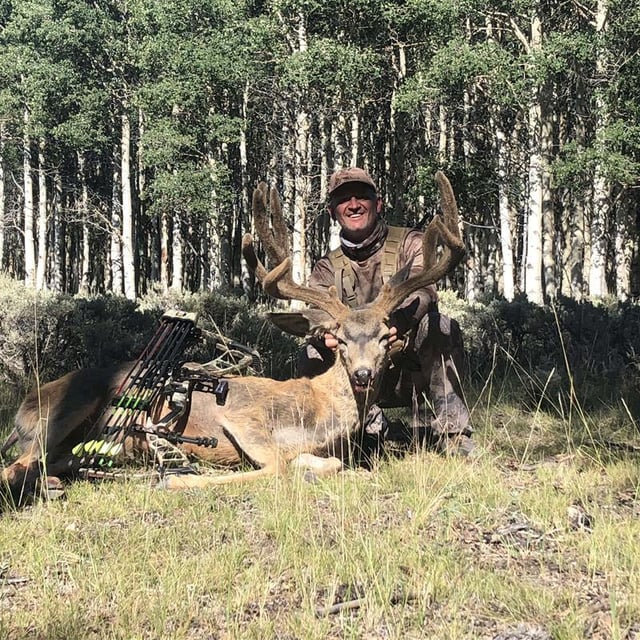 By 3:00, the deer were up and moving under the aspen canopy. As we were sneaking through on a well-used game trail, I caught movement 150 yards ahead. There were five bucks in the group, and Creedmore was one of them. The first couple bucks passed by at 42 yards. I looked to my right and confirmed that Koy had an arrow nocked. Fifteen minutes later, Creedmore committed. Koy drew and settled on the buck. At the release of the arrow, he went down immediately and expired within eyesight.