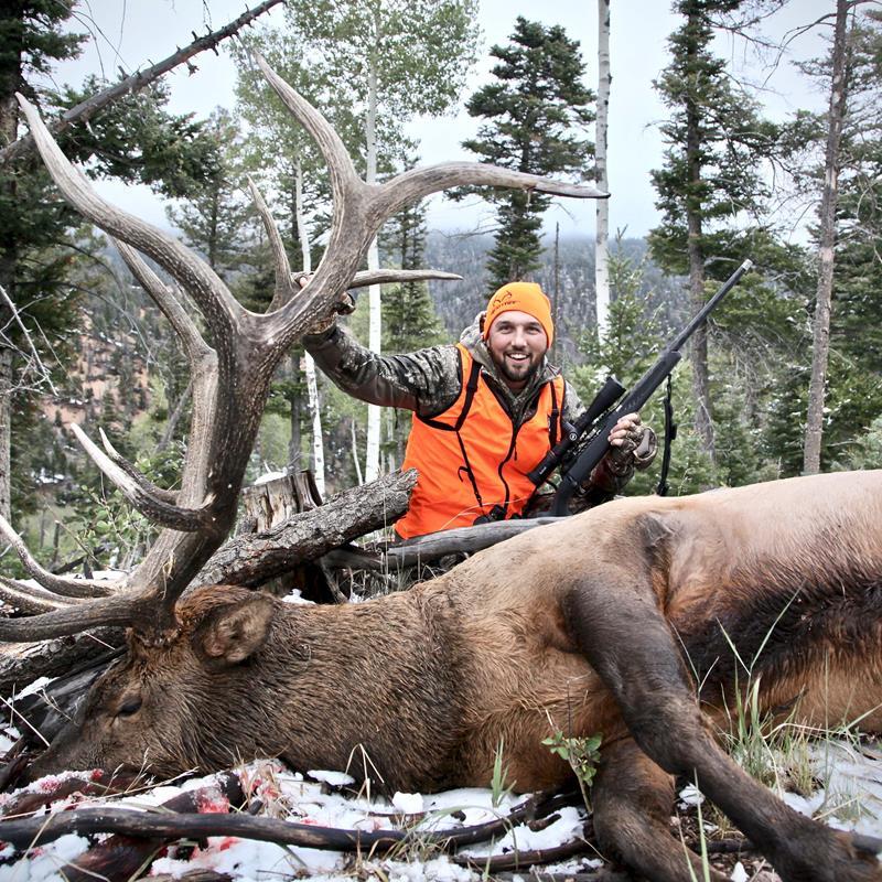 On the last afternoon of our hunt, we went back to the area where our hunt started five days before. We had seen a ton of elk sign on the old logging roads on this ridge but didn’t hear any bulls that day. After this snow, it was a different mountain. They were screaming everywhere. We got lucky and spotted a large group of cows going up the mountain with a decent bull pushing them. We had seen a number of bulls all week the size of this bull, so we didn’t go after this group. There were two bulls still down low that were bugling, and it sounded like they were going to come up the same ridge this group came up. We occasionally cow called to let the bulls know that we were there. They were talking but not moving much. I was starting to think that they might have cows since they were so hung up on the creek below us.