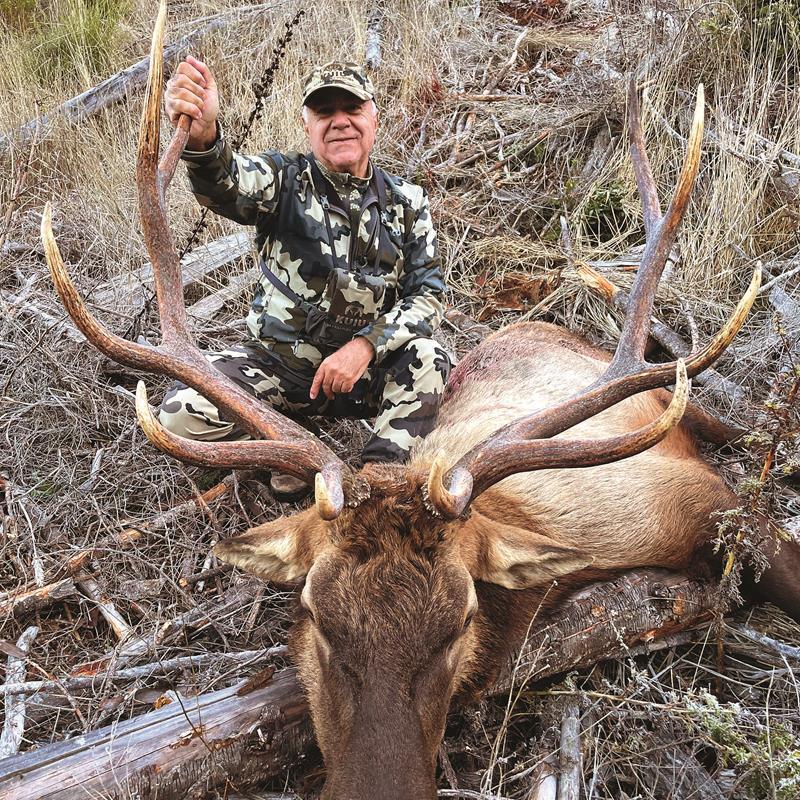 I drove to Coquille, Oregon, got settled in a brand-new trailer, and prepared my gear for the opening day of my season. Early in the morning, Ken drove me to town where I met my guide, Ross Morris. After the introduction and exchange of pleasantries, we took off for the hunt area. The great expanse of the timber companies’ leases that Ken had under contract was truly impressive as we drove for hours in the dark and opened and closed many gates before it got light enough to start glassing. Most of the time, we had been driving in the dark canyons covered with mature timber on both sides, but just as Ross was closing the last gate behind the truck, I glassed the slightly open area above the road. Less than 200 yards away, I saw antlers moving between the trees. I quickly got Ross’ attention and pointed to the elk. He took a quick look in his Swarovski and quietly signaled for me to shoot. I will never forget the short conversation that lasted not more than 25 seconds.