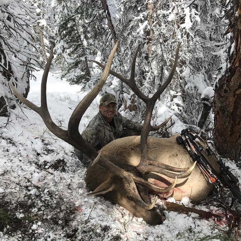 We had a pretty good wind blowing and it was cloudy, so the elk weren’t really startled and didn’t know what we were. They started to move a little bit, so Thomas said to shoot because the bull wasn’t going to be there much longer. I got set up on a rock outcropping, sat down, and put the bow across my knee. It was a 90-yard shot, so I put the pin on the bull’s back ribs as he was quartering away and let loose. He ran down a little saddle with his cows, so we waited about 20 minutes and then I couldn’t stand it. I told Thomas that we had plenty of snow and the bull was going to bleed so we’d be able to track him.