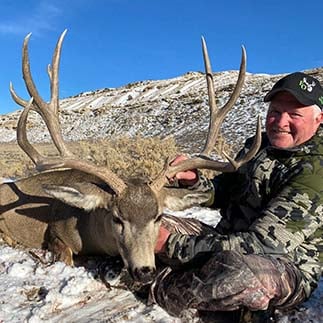 One of the guys who had located the buck was Dave Brown from Pronghorn Guide Service (PGS). When Dave is not busy with PGS, he helps Chance chase big elk and mule deer. Dave also had a friend with him, William Weaver, who had just finished a deer hunt. When Chance and I met up with Dave and William, the buck was bedded down and out of sight. While we waited, Dave and Chance ranged the spot where the buck had laid down at 375 yards. I dialed in the yardage on my scope and got my rifle set up for a shot when the buck stood up, which happened after a couple of hours passed. It did not take long for Chance to look over the buck and say, “That is a shooter.” I got behind my rifle and found the deer in the scope. There was some light brush right in front of him, and I was concerned about it. Dave said, “Don’t worry about it. He is right on it.” I squeezed off the shot, the deer tipped over backward, and it was over. Congratulations were shared all around. When we walked up on the buck, it was everything we expected it to be.