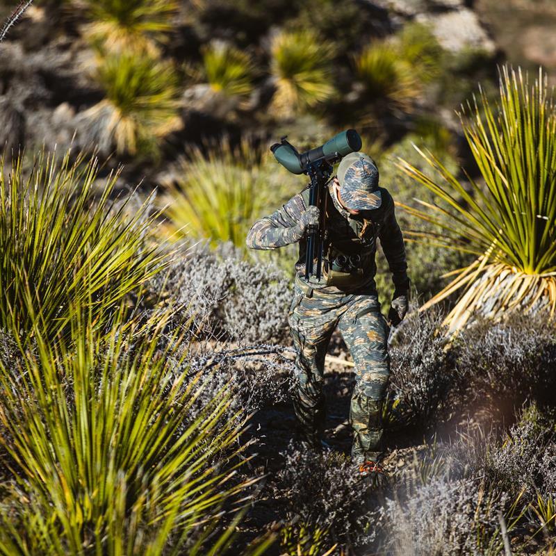 The Chinati Mountains were unlike any terrain I’ve ever hunted. The peaks and canyons are vast, and they’re covered with more varieties of cactus than I knew existed. Sotol and yucca plants dot the landscape as far as the eye can see. I was very thankful for the Kevlar on my gaiters. At first glance, you wouldn’t think animals could survive there. Its biodiversity of wild game is one of the largest in the country. Mule deer, elk, mountain lion, whitetail, javelina, bobcat, bighorn sheep, and aoudad all live in these mountains.
