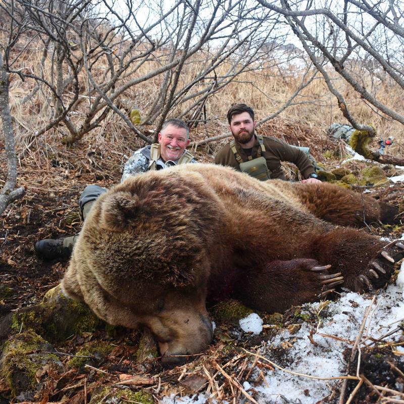 over the next few days at camp as I would observe whales, seals, otters, loons, and many species of sea ducks that were at home in the frigid water. “Big country” is an understatement, especially in contrast to the Ozarks we called home. The oak ridges we were familiar with have a sense of intimacy in which anything that you can see, you can touch, and even the biggest of basins are a quick walk from being explored. The opposing shore across the bay seemed close, almost swimmable if a man had a reason to. Karl asked me how far I thought the shore was from our camp, and I replied with, “500 yards or so.” He quickly informed me that it was actually one mile almost exactly. This was a wake-up call as the opposing shoreline looked just as intimate as an Ozark’s ridge in comparison to the snow-capped peaks that loomed over us behind our camp. After getting all our gear organized that evening, we had a meal of moose, rice, and onions to the soundtrack of Karl Braendel’s hunting stories that a lifetime of chasing Alaskan game had gifted him. It had finally set in that we were on a bear hunt.The next morning consisted of bacon, eggs, and countless hunting stories. Karl told us stories of all of Alaska’s game animals and the interesting clients he had put on them in his 45+ years of guiding. As the day warmed, we confirmed the zero on Danny’s rifle on the beach by camp. After Danny shot a tight three-shot group into the target, my gaze shifted toward the mountain peaks that made up the horizon behind our camp. The snow- covered peaks with windswept chunks of exposed slate-gray rocks were just as breathtakingly beautiful as the water-worn shores of the bay and had a way of captivating onlookers in a near trance-like state. What snapped this trance, however, was the realization that one of the exposed rocks was moving very quickly from left to right across the mountain. A mad dash for binoculars confirmed that the first brown bear of the trip had been spotted. Karl and Kiche didn’t get to spend enough time evaluating the bruin through a spotting scope to thoroughly judge before it dipped down behind the mountainside into the basin behind our camp, but to an inexperienced Missouri eye, it sure looked like a giant. Karl called Sea Hawk Air on his sat phone and received a weather forecast that would make it impossible to hunt the creek they had initially planned, so we changed plans to spend a day or two hunting behind base camp where we saw the bear head today in hopes of catching back up with the blonde-tipped bruin. A dinner of moose burgers was devoured while we anxiously awaited the first “hunting day” that would greet us the following morning.We threw our packs on our backs and trekked up the hill behind base camp, trying to find a good spot to glass the mountainsides that stretched high above us. I tried my best to keep an open mind with no expectations of what I would encounter on the island, but the terrain was outside of my imagination entirely. A soft, mossy floor was covered in large concave dips. Not a single square foot of the land was flat, and with each step, we sank to our ankles as though walking across a mattress. As I tucked myself into one of the larger dips to shield the biting wind, I found myself overlooking a boggy bottom housing a system of three beaver ponds. Beyond the bog, which was roughly 500 yards across, was a foothill shelf. Above the foothill stretched the snow-covered peaks with a saddle between them, with the leftmost peak being the one the bear had traversed the day before. As the sun rose and its rays fell across the snowy mountainside, the bruin’s tracks were exposed as shadows spilled into the massive prints leading into a drainage between the peaks. No tracks could be seen leaving the drainage, leaving only the assumption that somewhere tucked out of sight in the blanket of alders was a brown bear.At 3:30, I noticed something dart across my binoculars. I glanced and saw two pair of mallard ducks flying out of the bog between us and the closest foothill. As an avid waterfowler, this was a welcomed surprise as greenheads were the last thing I was expecting to see on the island and the pairs almost made me feel at home. I snapped out of the trance as my gaze fell back to the mountain and immediately noticed a dark spot in a clearing to the right of the drainage. “I think I see a bear...” I told Karl. Then it moved. “Yes, that’s definitely a bear.” Karl swung his spotting scope in the direction of the bear, which piqued his interest immediately and didn’t take long to confirm as a mature boar.“Are you ready to climb a mountain?”We made our way across the bog, our boots sinking every step of the way as we trudged across the mossy floor. The foothill that looked innocent from 400 yards away became increasingly menacing as we approached. Upon reaching the bottom, I saw Danny gazing up to the top of the foothill as we began our ascent. “No, no, no, don’t look any further ahead than Kiche, take it 10 feet at a time,” I told him. I knew that focusing on the slope in its entirety is the fastest way to demoralize someone as I had seen many strong men become overwhelmed doing the exact same thing on the mountains of Camp Pendleton. As overwhelming as seeing the whole slope can be, forcing yourself to only see 10 feet at a time can turn an impossibly steep route into a challenging, but traversable trail. As we neared the top, I told Danny, “Just one more push and we should be real close to him,” but I knew deep down that we were still a long ways from the snowline where the bear was located.We summitted the first near-vertical slope and found ourselves looking at the same view we had from the initial glassing point. A long boggish bowl with another foothill the same distance away, neither of which were observable from our initial glassing point and this foothill being just as steep, if not steeper, than the first. As we quic