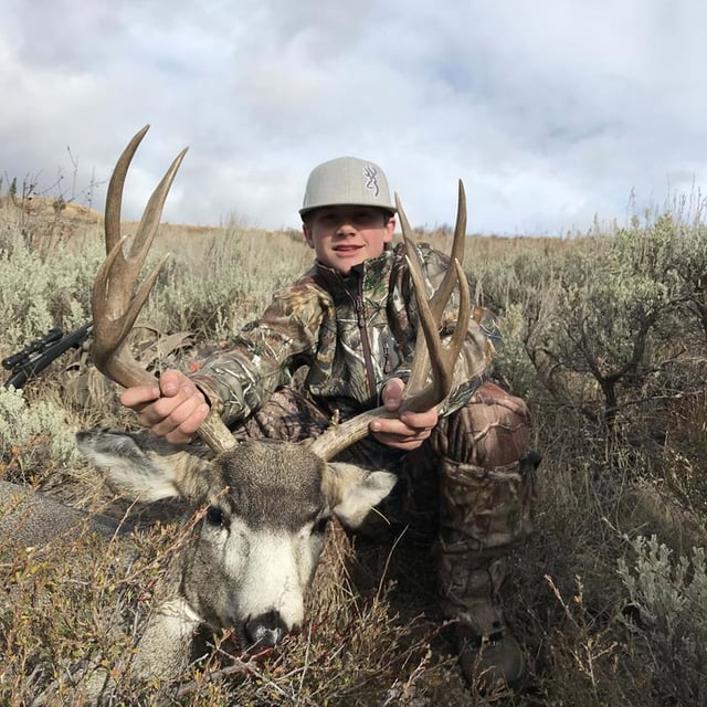 On Sunday morning, I wanted to go back to the same spot, hoping the bucks were there again. After glassing for a couple hours with no deer, my dad and my little brother decided to go back to the truck. I wanted to stay there and glass some more. About 15 minutes after they left, I spotted a buck. Something had spooked it up into the canyon. I hurried and hiked to the other side of the canyon to try to cut it off. When I came over the ridge, I saw the buck at 50 yards. He took off running, and I got one shot off before he ran into the trees. My family heard me shoot and came to see what had happened. We had my cousin walk down in the trees to see if the buck was in there. The buck came running out on the other side of the canyon, and I shot him on the run. When we got to him, we realized it was the buck from opening morning.