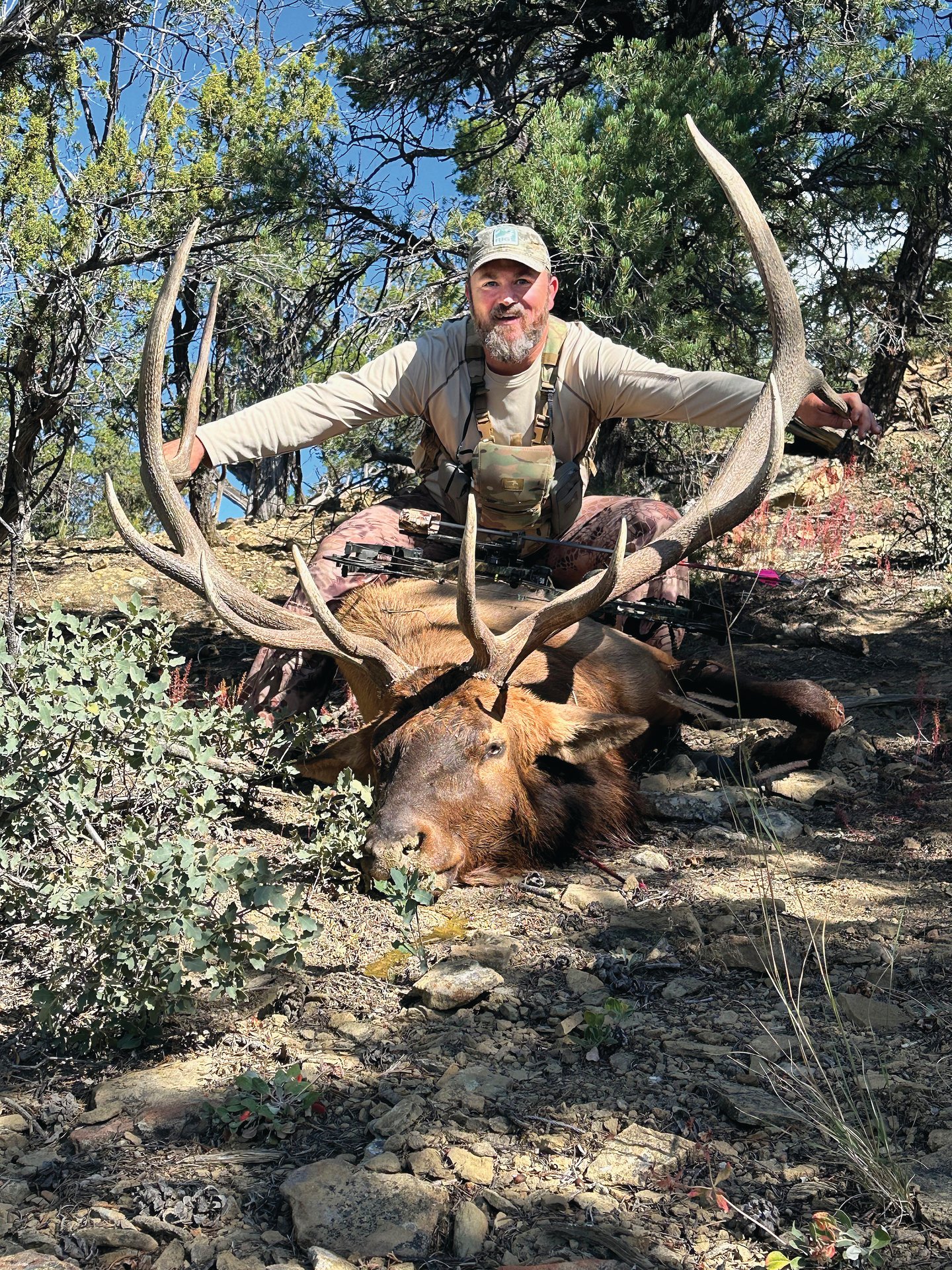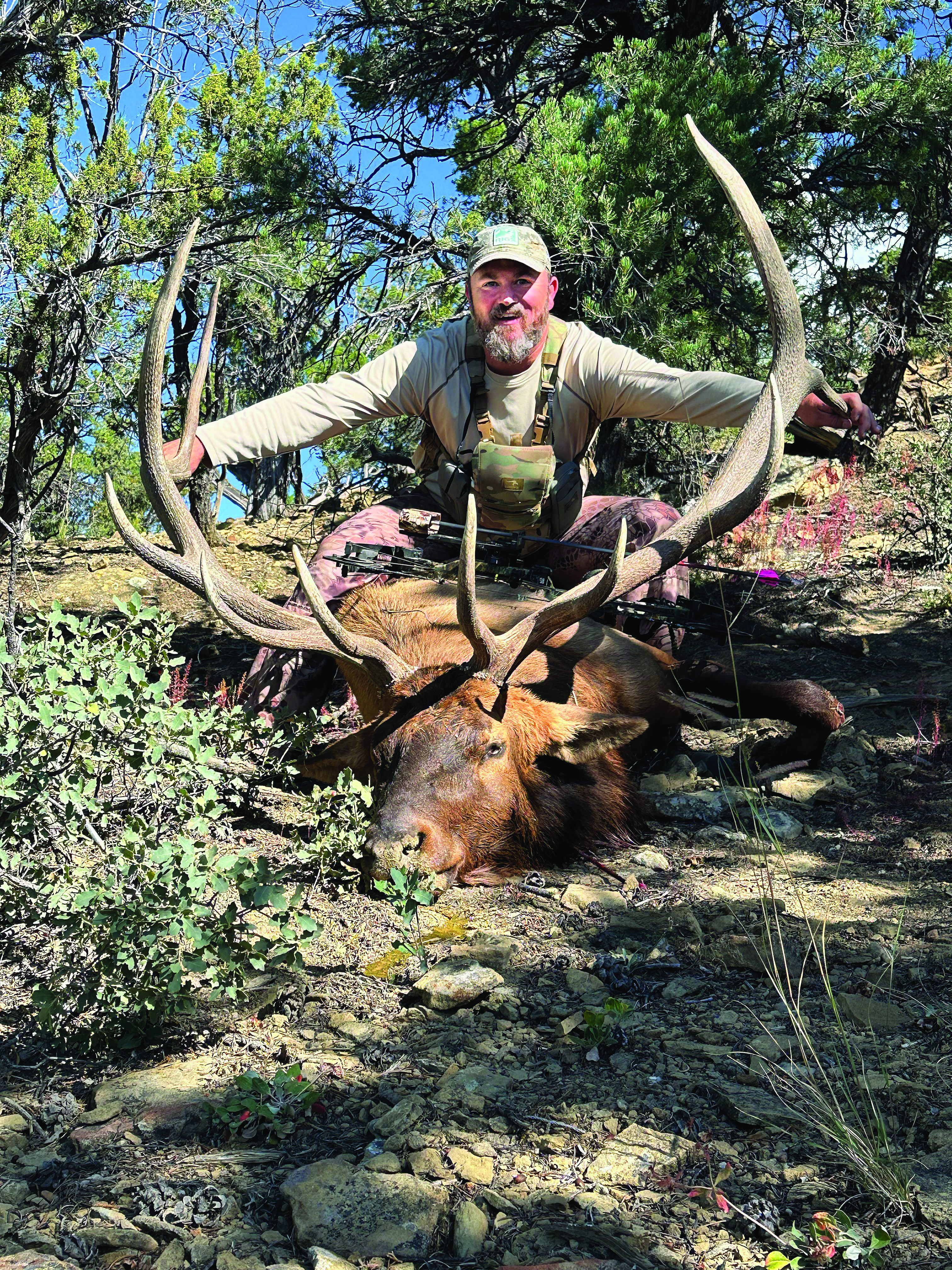 The shortest pin on my bow is 30 yards, and I settled it on his chest as he walked right at me and let it fly. It was a good shot, and I saw blood instantly. He ran down and back up the finger ridge right in front of me, crossed over the ridge, and disappeared. I was shaking so hard with tears of pure joy. I could not believe that on the ninth day of a 10-day hunt I got it done. I sat there a bit, thanking God for the opportunity and the guidance. I finally eased up to where I had shot him and didn't even need to take a step to find blood. I followed it over the ridge to my bull that hadn't gone more than 100 yards. As I walked around him, I knew this was a top-notch bull.