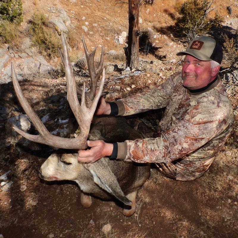 Just then, Craig called on the radio that he was in the next canyon over. We packed up and headed to the top where we could see into the next canyon. Georgie spotted the buck and set up the camera. The buck was at 200 yards downhill and standing straight away. I got a rest on an old tree and took the only shot I had. He went down, but I couldn’t see him. I ran about 10 yards when he stood back up. I took an offhand shot and later found out I had hit him in the ear. Thank goodness it was just the ear. I got another rest and put him down for good. We gathered all of our stuff and went to the buck. The whole crew came to see him. Jay told me I had just shot “The Grandpa Buck.” They had been hunting him for three years. He had to be around 10 years old. The one buck he had wanted to see shot this year was that buck. Talk about excited! The buck had huge mass, many points on both sides, and was exactly what I came to shoot. They asked if they could score him. I told them not to bother because he was big enough. It was an awesome feeling. I had just shot a named Strip buck, and it was exactly the type of buck I had dreamed about for 20+ years.