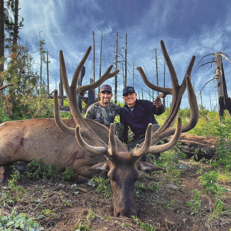 and before I could say hello, Mike said “I’m watching the Arizona Big Game Super Raffle and you just got drawn! You need to answer their call.” I immediately hung up the phone to check my messages. The message was, “This is John Colozar with the Arizona Big Game Super Raffle, and you might want to call me back.” I dialed the number and John picked up, “You won the Arizona statewide raffle tag, and you get to hunt elk for an entire year in the state of Arizona.” I just about fell out of my chair. This was the holy grail of elk tags.I immediately went to work on finding an outfitter to help maximize this opportunity. I decided to go with A3 Trophy Hunts. My initial conversations with Chad Rhoton just felt like a good fit, and from the very beginning, Chad told me I was going to kill a giant.After several weeks of conversations with Chad, I made my first trip down, and my brother, Joe, and friend Matt came along. We met Jay Lopeman for dinner that first night where he introduced us to Jed Larson. As we talked over dinner, I knew I had made the right choice of outfitter. We all hit it off perfectly, and I could tell right away these guys were real pros.The next morning, we got an early start. After driving for an hour or so, we parked the truck and took off hiking up the hill. As we reached the top, we started spotting elk. Joe, Matt, and I looked through our binos and we were like kids in a candy shop. These were not just any bulls, but big bulls. Good thing we had Jed or we would have probably been tagged out right then. We ended up hunting several areas on that first trip and looked at numerous bulls but never found anything worthy of the tag.Over the next few months, we continued to look at bulls but never found anything we wanted, so I was going to have to wait until July or August of 2023 to fill my tag. Given the wet year and great supply of feed in 2022, we expected phenomenal antler growth in the following year and the chance of a real giant.Fast forward to July 9, 2023 when I got a call from Jed, saying, “I think we might have found something special.” As the week went on, Jed stayed in touch, and by the third call, I could tell things were intensifying. Up to this point, he had been pretty calm and not shown much excitement about the bulls we had looked at, but I could sense a change in his tone on this one. Jed went on to say, “I can’t say how big, but you need to trust me and get down here.” My 22-year-old son, Sam, and my brother, Joe, were sitting in my office. I said, “What do you guys think?” They replied, “You better find a way to go now.” I asked Sam if he could get away, and his response was, “Heck yeah, Dad! I wouldn’t miss this for the world!” Joe was also ready to go, and our friend, Matt decided to come along as well.We headed out early Saturday, and our plan was to stay the night somewhere along the way and arrive in camp on Sunday. It was a long drive, but Sam and I had some great conversations along the way. He had just completed his education to become a professional crop advisor, and we were excited about him coming back to the family farming operation someday soon.We got to our hotel, and as we were checking in, I got a call from Jed. “We found the bull tonight, and he’s in a good spot. Can you be in camp by 2 a.m.?”I looked at my watch and said, “It’s 10:30 p.m. now and you’re two hours away. Are you serious?”He said, “Yes, this bull is a giant and we need to try and get him now.” Sam and I looked at each other and said, “How big is this bull?” Jed said he was running with a 400" bull and he towered him. Sam and I quickly looked at each other and said, “We’re on our way!”When we finally arrived at camp at around 2:30 a.m., the A3 team had 12 guides gathering gear, packing packs, loading trucks, and making a plan of attack. The plan was for several of the team to split up and spot from various locations while we moved in to where the bull had last been seen the night before. Iseha Conklin and Tyler Mott would be going with Jed, Sam, Joe, Matt, and me. We started hiking at around 3:30 a.m., got to our position at around 5:30, and then stopped to wait for it to get light.As the sun rose, we made our way up the ridge and started glassing. No bull! We all scanned the ridge intensely, but he was not there. We knew he had to be close, so we decided to move in closer to the next ridge. When we got there, we sat tight. There was fresh sign everywhere, so we knew we were close, but it was brushy with limited sight distance. We decided to split up and see what we could find. Within minutes, Iseha came back with eyes as big as saucers. “I found him. We are only a few hundred yards away.”At that moment, everyone got really serious. I got my gear together, Jed was ready, and the wind was perfect. We started sneaking through the brush, and after 150 yards or so, we spotted them on the next ridge. We got set up and ranged them at 550 yards. There were six bulls, and they were making their way up the next ridge, meandering through the brush, so the view was not clear. Jed had explained earlier that there were two larger bulls, one named “Bonfire” that had a bladed antler and his buddy “Sticks” who was much larger. That was our bull. Just as I was getting settled, the bulls stepped into a small clearing and the choice was obvious. I found Bonfire first and right behind him was Sticks. He was a giant compared to the other bulls with split daggers, giant fifths, and huge mass. I waited for what seemed like eternity as Bonfire was blocking the shot. Finally, I had a clear shot at Sticks. I squeezed the trigger on my