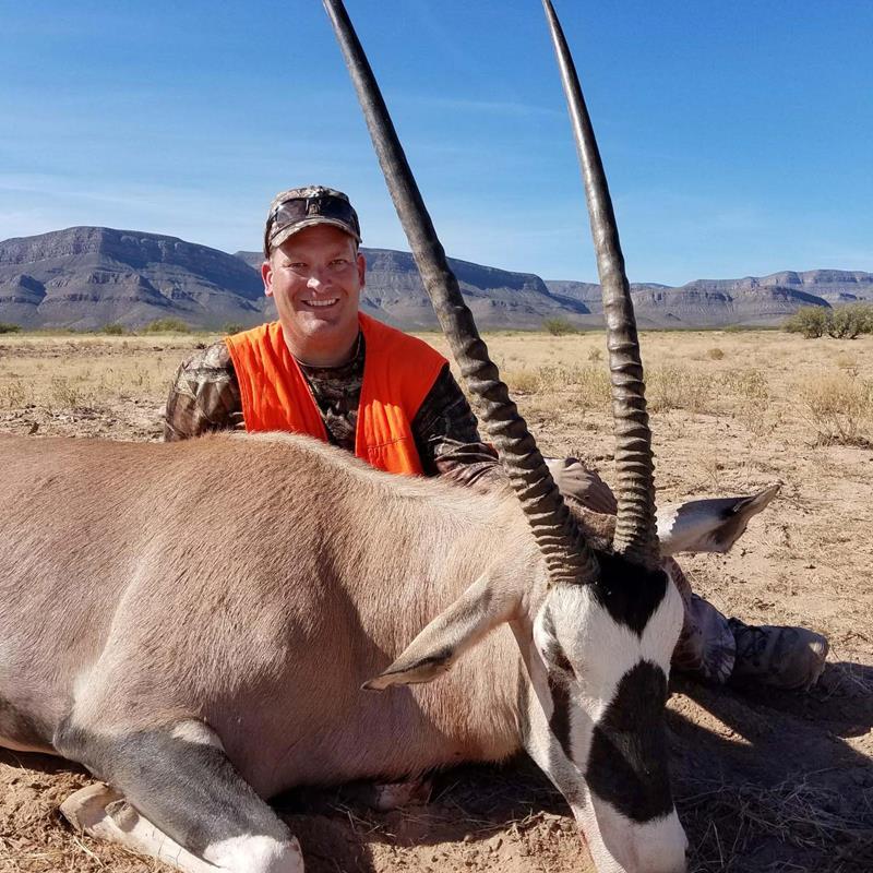 As we worked our way through the brush, we spotted a great bull and decided to try and get a closer look, even though he had already spotted us. As luck would have it, there was one bush in front of us that we were able to use for cover. We made a quick advance to get within 300 yards. As I got ready for the shot, Jim confirmed that he was definitely a shooter. I steadied the .300 Win Mag for the shot just as the bull started to run. My shot was a little further back than I would have liked as the vitals on an oryx are further forward than most big game animals we encounter in the U.S. Fortunately, he only went 40 yards before bedding down. We were able to finish the bull without having to track him. Now that we had our once-in-a-lifetime trophy, we celebrated and snapped a few photos. Then reality set in. We only had six hours to spare before the gate closed, and we were several miles from our vehicle. It was a race to get him field dressed, in the truck, and to the gate before 6 p.m. We saw over 80 oryx in the time that we spent coming in and out of the area with our trophy, which was more than we saw combined over the entire hunt.