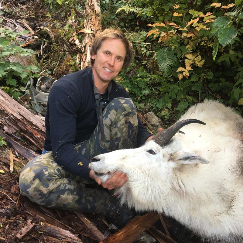 As hope was fading, Todd yelled, “I found blood!” After a short discussion, the choice was made to follow the blood as far as we could in terrain that did not exactly resemble “safe.” A half mile of tiny blood droplets later, we decided that unless our wounded prey got sick very quickly, we would have to turn back if we wanted to stay alive. After finessing our way another couple hundred yards, Todd said, “Looks like he’s going to get over into Snow Gulch.” I threw my binoculars up for a closer look. As if God had willed a miracle, there lay the wounded goat 150 yards away behind a thick mess of mossy branches. I was overcome with emotion but had to act fast as complete darkness was minutes away. We decided I had to try to shoot through the thick branches and near vertical terrain. After the shot rang out, it was obvious the goat was hit again. We watched with dread as the goat stood back up and staggered out of eyesight.