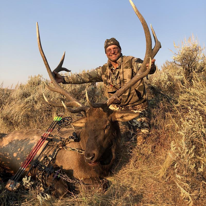 Still behind the cedar, I was ready, and then the bottom seemed to fall out. Over TJ’s right shoulder, I was looking directly into the eyes of a cow elk 30 yards away. Simultaneously, a quick glance over TJ’s left shoulder, I saw a great black face and a massive set of antlers looking right at TJ. I am a left-handed shot. My only chance would be to step out behind TJ and execute a left pivot followed by a quick presentation and shot. Thankfully, this is something that great Marine Corps Sergeants and Corporals had drilled into me countless times in my other life. I drew as I stepped out and pivoted with a feeling of absolute calm. The bull wheeled like a quarter horse and broke to go as I was coming around. TJ let out a “mew,” and the bull paused for an instant just as I cleared TJ. My 40-yard pin came up on his ribs, and the arrow was away before I knew it. We saw it sink into the bull, and then the sage exploded with what we later estimated was 20 head of elk that we had not seen before, blowing out in a cacophony of sound and dust. And then there was quiet.