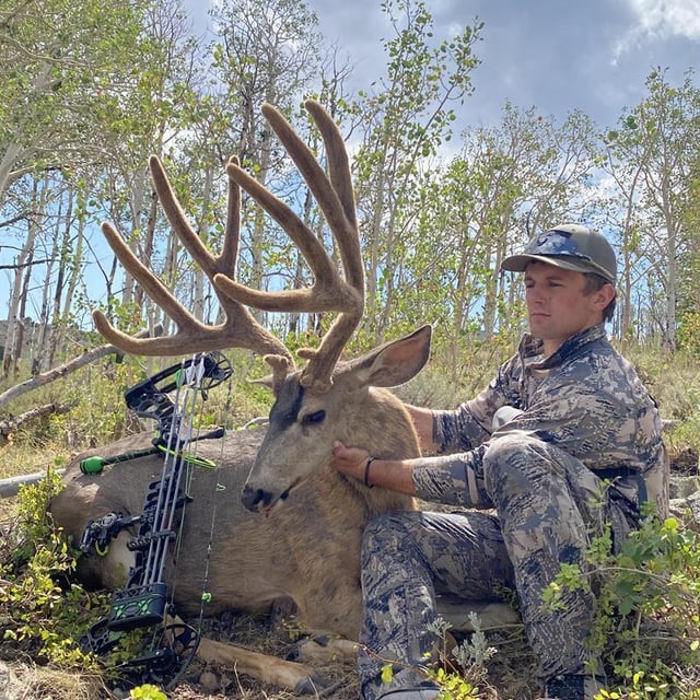tag and made it my goal that it was “Flare or bust.”Locating him in late July, I still had a few weeks to pattern him, and man, could this buck cover some ground. My dad and I spent days setting trail cameras, glassing, and racing the sun to and from work as we watched this buck finish out his summer growth without another hunter seen. With a game plan set, we loaded the camp trailer and headed for the hills. What happened next still blows my mind. Flare jumped out in front of the truck three and a half miles as the crow flies from where we had watched him for weeks. The brakes were to the floor, a near miss occurred, and confused looks fell on our faces. Speechless, we watched him trot to the tree line, taunting us by feeding in and out until dark. I felt nervous that he had changed up his schedule but excited that I could finally hunt him at sunrise.A new plan was made, and we slept very little. The next morning, we set off on a hike to get a better angle for glassing. My dad quickly located him at 450 yards, and he had picked up a doe and another stud buck overnight. We closed the gap and waited for the deer to make up their minds. Into the ravine or back in the thick trees? After about 30 minutes of backtracking with no shot opportunity, he finally broke off from the other deer and fed very quickly up the ravine we were at the top of. There I was, full draw on Flare’s ribcage. My dad ranged and whispered, “Just breathe. He is at 40 yards.” He only needed a few more bites to be out of the trees, offering me a clear shot, when he bolted straight past us and stopped at 120 yards. I was still at full draw, hoping the best of the situation, so I proceeded to sneak to a tree about halfway between us. When I had peeked out behind the tree, he was gone. On our hike back to the truck, reasons of why he busted us were running through my head when my dad simply said, “Shawn, he didn’t get big by being stupid, you know. This just means we get to keep hunting him.”Fast forward through the 2019 season and into 2020 when we hit the summer scouting even harder. Any given chance, my father or I were covering ground, narrowing in on him. I drug some trusted friends and even the girlfriend up the hill and found some solid bucks, but I found myself sleeping in the truck by Flare’s canyon the week leading up to the archery hunt. What I joke was just luck, my girlfriend, Brylie, claims is skill. The second day into my hunt, she glassed up a group of big bucks right where I originally found Flare. I scanned through them a few times. They were all familiar bucks but still not the one I was after. I continued glassing through the canyon when she insisted one was big. I knew I couldn’t take my eyes off the spotter. Trying to stay calm, we watched him peek over the hill for a quick meal and retreat into his hole of thick pines full of my trail cams.I knew he was smart and that I had to be patient. The next eight sleepless days went by with no more sight of him. By now, I had moved on from sleeping in the truck and had my camp trailer on the hill. On August 24th, I left straight from work alone with the intention of glassing the “what-if” spots. Thirty minutes before sunset, I found him. He was with a smaller buck, feeding quickly across the sidehill on his way to a bench that connected two peaks. I knew that if I beat him to the trees in the bench, I might have a shot. I beat him to the trees unseen and slowly army crawled and ranged repeatedly until I had him at 90 yards. I did not want that shot, so I awaited his move. An eternity of 10 seconds later, he bedded down with the sun. Disappointed and more trigger happy than ever, I withdrew to the four-wheeler. Once I caught my breath, I briefed my family and close friends on what had happened. Jesson Williams, who was hunting that night as well, had the next day off and offered to come spot for me the next morning. We met at the trailer for a bowl of Ramen, knowing tomorrow was the day.An hour after sunrise and past the time I had to leave for work to be on time, we still hadn’t found him. I am a firm believer in “one more time,” so as we gathered our things, I did one last scan of where he had bedded the night before and caught the tips of some velvet. It was him. I phoned John Mogle to see if I could come into work late that day, and he replied, “You bet. Go get that sucker!” Game on.With Jesson on the spotter, we agreed on some landmarks and I ditched my pack and went in. Flare didn’t stay in the open for long. He continued up and over into a small basin about halfway up the hill. Jesson radioed for me to work slowly into the quakies when I got to the biggest boulder on my path. Stepping on dry leaves and deadfall, I decided to stop for a few minutes and just listen. Flare’s hole was behind me, so one way or another he would have to cross me to get there. I listened and heard that distinct sound. Not the branches breaking sound that cows make, but the sound that the buck I had wanted so badly was near me. After a few minutes of quietly glassing through thick trees and shrubs, I caught his antlers through a tree at 64 yards. With absolutely no shot, I army crawled to my left where there was a slight opening. As I peeked out from behind a tree, his two-point buddy had me pinned. I didn’t have a clue on what to do, so I laid on my stomach, sprawled out for about 15 minutes. I finally heard more movement, so I fumbled for my radio. They didn’t bust me, they had backtracked their way out of the basin and into Jesson’s sight again.I retreated to where I came from just like the deer did and regained sight with Jesson across the canyon. He informed me that Flare was leading the pack and not backtracking every 20 yards. I worked my way around the tree line to get closer when my radio hit static. Standing on a rock in the trees where only Jesson could see, I raised my bow in the air. “He’s probably 200 yards up the hill.