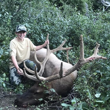 Huntin’ Fool. He told me I better shoot a big ram then.My dad had already reached out to Garth at Huntin’ Fool to get help finding an outfitter for my elk hunt. After a few conversations and phone calls, my dad and I decided to use Pine Valley Outfitters for my elk tag and hunt Cedar Mountain, and then we would hunt the extended season archery in New Harmony and the sheep in Nevada with our good family friend, Shad Leeder. September could not get here fast enough. My dad and I spent the months of June, July, and August getting ready for my hunts. Every weekend, we would practice shooting. My dad would tape different colored balloons to cardboard and set up targets at 300, 400, and 500 yards. He would then tell me a color and the distance, and I would find the target, adjust the yardage, and pop the balloon color he called out. During the week, I would practice shooting my bow in the backyard, eventually building up the strength to pull it back at 40 pounds. By the time September rolled around, I was confident and ready to start what would end up being the best four months of my young hunting career.While this story is about my sheep hunt, I did harvest my first elk with Wade Hollerman and Kyler Carrizosa of Pine Valley Outfitters. It was a small 5x6 that I took with one shot at 550 yards. I also harvested my first deer with a bow in November, a 4x3 at 20 yards.Finally, December 5th