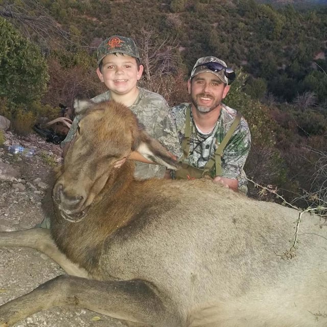 The elk hadn’t moved, so we backed of the magnification so he could see it again. Once I heard him say, “Dad, I got it!” I slowly increased magnification but not quite to full power. I asked Thomas if he could still see the elk and he said yes. I told him to aim just behind the front shoulder of the elk and shoot when he was ready. About five seconds later, the gun went off and I watched the elk drop instantly! Thomas made a perfect double lung shot, and the cow did not move more than five yards. We started hugging and screaming for joy! We could hear Adam on the ridge behind us screaming and hollering with joy. What a great moment! Just when I thought it couldn’t get any better, Thomas told me, “Dad, I feel like I could do anything!” This experience taught my young boy a valuable lesson that if he puts his mind to it, he can accomplish almost anything, not just in hunting, but in life!