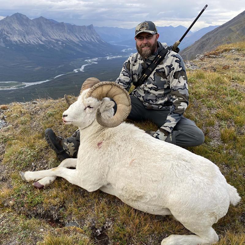 and met up with Steve Johnson with Ultimate Alaskan Adventures for him to review my gear and to get my license and tags. I was good to go on clothes and equipment, so we were ready to hunt.On day one, we met up with Mitch Davis (my guide) and flew into the Alaska Range on a Cessna and landed on a small runway just off a large river. We then jumped in a boat and started glassing for sheep and looking for a place to camp. We saw several sheep that day, including two rams that were just not quite big enough. We spent the next day glassing from the boat with no legal rams to be found. On the afternoon of the first day of actual hunting, we spotted a ram that we thought was legal, but we needed to get a better look at him.We could see the ram the next morning from where we set up camp, and he had actually moved one ridge closer and we had a better view. At 10:00 a.m., we decided to go after him and started our stalk. From the river, we hiked several hours through the forest with the soft undergrowth and tall evergreens. Then, we spent about an hour trying to work our way through the thick brush. Eventually, we hit a creek/waterfall and followed that up the mountain until we got to “sheep country.” At this point of the hunt, when we finally get to sheep country, I was almost done.We started the steep climb through the grass and loose shale for about two hours and then we finally hit flatter ground. Steve and Mitch were ahead of me by about 100 yards, and they were behind a rock, glassing for the ram we had seen. As I looked up to see the area they were looking at, the ram stood up and was in plain sight of me at 300 yards. I froze in the wide open with absolutely zero cover and thought that the hunt was probably over. It was a staring contest that felt like it lasted hours but was probably only a few minutes. The ram calmly walked over the ridge, and it appeared that he might have bedded down. We jumped up, leaving my pack there, and climbed up the ridge between us and peeked over a rock. We could see the top of his back and his head as he grazed for several minutes at 125 yards. Eventually, he fed off in the opposite direction as we sat wondering whether we should wait or aggressively go after him.It was just a few minutes before we decided to go after him. We low walked for about 50 yards and then bellycrawled the last 50 yards. My left leg kept cramping up as we were crawling, but I knew that I could not give up after coming this far and being so close. As we slowly crawled, eyes on the horizon, we all saw the tops of his horns at the same time and stopped. He was bedded down, looking away from us with no worries in the world. I sat up straight, got my rifle propped up on my knee, and waited for him to stand up. It wasn’t but just a few minutes before we saw his head start to move and look around and he stood up. I squeezed the trigger, and he immediately went back down. We jumped and ran to where he was and saw that he was just barely lying on the edge and still moving. Steve and Mitch ran and grabbed him by his back legs and dragged him a few yards back to keep him from falling off the cliff. We were all staring at each other in disbelief that we were able to get so close and actually pull it off as we watched this great ram take his last breath.We staked a tarp in the ground and dragged the ram under it to clean and cape him out before the rain started. We stayed on top of the mountain that night and packed him out the next day. The trip in was almost four miles, and we gained 3,000 feet of elevation. It took seven hours to get to the top and five hours to get back down. My advice to anyone training for the hunt-of-a-lifetime would be to establish a workout program that you can commit to and then double it. The walk back was almost as hard as the walk up, but the feeling of going out with that heavy pack always beats the feeling of going out empty handed.Steve and his guides were outstanding! Thanks again to Huntin’ Fool for the opportunity to experience a hunt-of- a-lifetime!