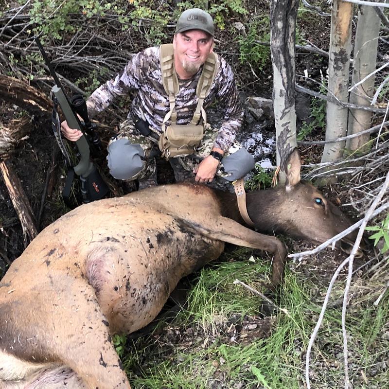 When the smoke cleared, two elk were down. We jumped up, hugged, and high-fived while striving to find the words to describe what had just transpired. When we turned our attention back toward our downed elk, we noticed only one. Mine was gone. I scanned each group of strangely calm, retreating elk for an injured animal. Nothing. We continued descending the steep shale slide toward the stream. We finally reached the bottom and came up toward the bench where Nate’s elk lay when we discovered mine had rolled from the cattle trail through a fence 25 yards down and through sage and saplings to rest right in the middle of the stream. Relieved, we took our pictures and began the daunting task before us. We finished mine by about 2 a.m., rested back at camp for four hours, and then returned to work on Nate’s elk at sunrise.