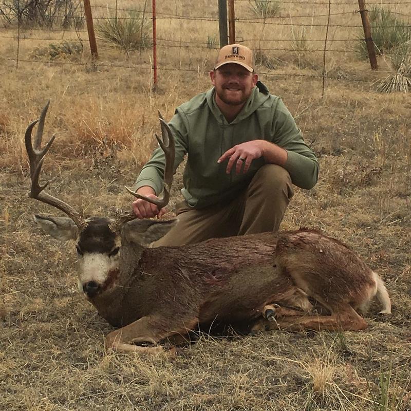 To end the season, I had my archery mule deer tag. On my fourth day out, we spotted six shooter bucks. Of these shooters, I had an old 4x4 that had the largest body I had ever seen. I wanted him just for the fact of how large the body was and the mass of the antler bases. Unfortunately for me, he got tagged that afternoon. On the fifth day out, we spotted one of the other five shooters. This buck we had named “Crown” due to the right side having a three prong that looked like a crown. We were able to predict where he was heading and ended up with a 45-yard shot. I pulled back as he was grunting at a doe and released my arrow. It was a clean hit, and now it was off to fill the freezer for the last time of the season.