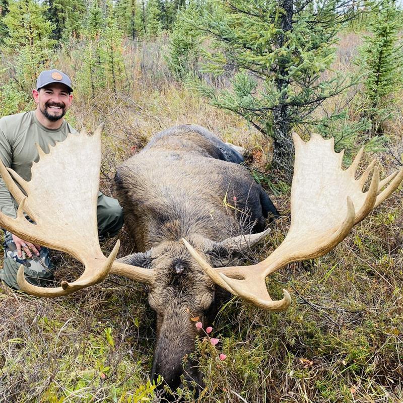 to rid him of this empty feeling (and mine), but this time, we’d go self-guided.The main idea was to hunt a river he had visited once before and make it a 14-day downriver float. Gear was accumulated, a pilot was secured, and the plan was set, or at least we thought. Seven days prior to the hunt, one of the guys had to drop out due to personal reasons. The problem was, he had the knowledge and experience of the area. Drew and I had to take the reins and go on without him.We arrived in Fairbanks on September 3rd, and the plan was to fly into the bush the next day. Getting ourselves and gear would take two flights via Cessna 185 on floats. Unfortunately, the weather kept us trapped for four days in Fairbanks.After four days of foggy weather, we were finally headed in the direction of our destination. We eventually came to the foot of the Brooks Range Mountains and saw our riverfront ahead. To our surprise, the river was way up and the pilot was able to land just about anywhere. After a few moments, we were beached, unloaded, and waving goodbye. We set up camp and went for a walk since we weren’t allowed to hunt until tomorrow.The next morning was very cold, and we started a fire while making some coffee. As we enjoyed the warm beverage and ate breakfast, we focused on seeing if anything was within our area. We made a note to always start each day by calling right from camp and listening for at least an hour.The pilot showed up later that day, which didn’t leave us enough time to assemble the boat and break camp. We were off to a very slow start.On day three, we woke up to heavy, heavy rain, but we were finally heading downriver and checking all our onX locations along the way. It didn’t take long until we realized that hiking to certain viewpoints or getting to certain clearings was no easy task. It was at the end of day three that we settled on the 300 and in rule – no shooting a moose that was further than 300 yards off the river. Most importantly, no shots fired at moose over water.On day four, we packed up and headed to our prime spot we called “Forbes Flats.” As we rounded the last corner, we heard the willows rustle with movement. Our first moose was coming out for a drink. We floated 25 yards away as the young bull watched us. We found an old campsite with moose sheds and good firewood nearby. Camp was quickly erected, and we hiked to the viewpoint for the remainder of the day.The following morning, we returned to the viewpoint. The fog was thick up there and kept us by a fire until 9:30 a.m. Once lifted, we scoured everything top to bottom. We were confident that with time something would show up here and give us an opportunity.At midday, we jumped in the boat and floated six miles down to see if anything had bedded on the riverbank. We then finished our day at the viewpoint. Nothing new, but we did manage to find that young bull again.The following morning was socked in with fog and everything was frozen. I suggested we start with a river float since glassing was worthless. After we reached our six-mile mark, we turned around and motored back up. After a quick bite, we made it to the Forbes Flats viewpoint. Little did we know how quickly the pace of our trip would change from here on out.After glassing for a few hours, I stood up to stretch while Drew tended to the fire. It would be dark in 30-40 minutes, and we figured it was our last effort for the day. I then heard a peculiar sound. I focused my eyes, and to my dismay, I saw a massive figure walk into the furthest corner of the flat 1,000 yards away. The white paddles were a beacon like nothing I had ever seen before! The bull grunted every other step. He never stopped to look or graze. We tried calling, but he gave us no mind. In less than three minutes, he had reached the river and was gone.On day, seven, we woke up extra early and moved with precision as we gathered ourselves and stepped out of the tent. Before anything else, I let out a cow moan and something answered. A bull was in the area! We grabbed gear and made haste to the viewpoint.Upon arrival, we didn’t see or hear anything and the rain arrived. We built a shelter, and for several hours, nothing. Then Drew spotted a body in a small clearing in the middle of the dense ocean of spruce. Cow moose. Seconds later, another figure appeared. It was a much bigger outline with head gear. He circled the cow, smelling the air, brow tines to the sky.Drew whispered, “I only see three points on the brows, Dunbar.” He was right. Now we played the game of 50"+. All we needed was for him to face directly at us and hold for a quick photo. Finally, I got a halfway decent view and that made me say, “That’s a legal bull.”I already had my .300 PRC bagged up and leveled with MOA adjustments made. I nestled in behind the Nx8, the bull stood broadside, and that’s when my brain decided to freak out. “Are you sure he’s 50+?” From this far out and having only several hours of field experience, this was no easy task. I got back up and walked to my spotter.“What’s wrong?” Drew asked.“I need to be absolutely certain before I send it. One last look, and this time, it needs to be a dead straight on stare down”. For three or four minutes, I stood behind that spotter. Then it happened. He turned his bus of a body about-face and gave me the 1,000-yard stare I was wanting. I returned to my rifle, and the first shot landed solid. The bull jumped 10 yards forward and stood stone still but now quartering hard away. I heard a whisper through my hearing protection, “Impact. Good hit,” Drew confirmed. With zero hesitation, I cycled and reset the cross on the last rib. The second shot landed spot on and sent a burst of precipitation in the air, rain that accumulated on his hair. I knew that was all that was needed, but I sent a third just to be sure. Big Boy was down!We had a fix on his position using onX, and once the boat was beached, we moved in. The terrain
