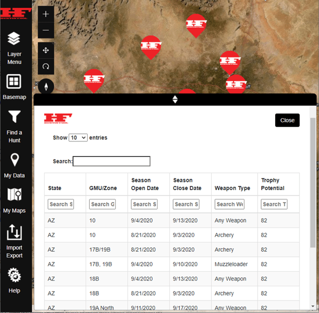 Draw, manage, and store a line/path on the map. This feature allows you to save a path to your data management system. It stores the data just like your waypoints, in folders. Share among other Huntin’ Fool members or export to a kml. This feature was a huge improvement to our data management system. You can change the width and color of the line, along with displaying the distance of your line. It will also give you a measurement of the path you just drew on the map. Find Hunt Data Filters, Table, and Results Update