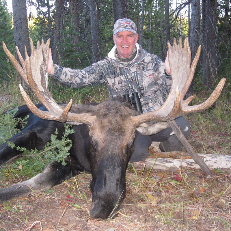Tony and I continued on our moose hunt. I noticed a black shape in the woods to our right. Stopping quickly, I brought up my binoculars to determine that it was a bull moose. The bull had long tines on his left side and a nice spread to his palms. The bull turned his head to show me his right side, and I decided this was the mature moose I had come to Wyoming to hunt. I slipped a cartridge into my .300 Win Mag, settled the crosshairs into the middle of his front shoulder, and gently squeezed the trigger. At the crack of the shot, I saw his massive rack and body shudder and antlers snap back at the impact of the bullet. He hit the ground with a thud and was done.