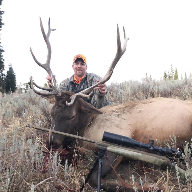 I ended up back near my morning glassing point and decided to babysit the huge meadow in front of me for the evening. I hadn’t sat more than five minutes when I spotted a few cow elk stepping out into the opening. Out loud and to myself, I said, “Yes!” They were 1,000 yards away and the wind was steady in my face, so I boogied closer, keeping terrain and trees between us. I was hoping that there would be a bull following those cows. The best approach was through a dry creek bed that split the meadow north and south. As I got closer, I dropped my pack and left the gravel to sneak through short sage. I was on my hands and knees, but it was like crawling through cornflakes. The wind was still good, but the elk could hear me. They were all heads up on red alert and looking in my direction. They still couldn’t see or smell me, but I could tell that getting closer wasn’t going to happen. I poked my head up and over the sage and ranged them at 400 yards. I then got set up with my shooting sticks and dialed in my scope. The elk relaxed a bit and began to feed. I could see six cows, then seven, then eight. Suddenly, the bull materialized, and he was looking in my direction. I couldn’t believe my luck! I remained motionless, and he finally committed to grazing with his cows. He cautiously stepped out, and I almost touched off a round as he moved. I waited, and he walked right into the middle of the cows. I had no shot. For at least 10 minutes or more, he stood with his cows and surveyed the meadow. My hands were freezing. Suddenly, his attention was drawn to my right where another bull started raking a tree. I couldn’t see the other bull, but he had the attention of the elk in front of me. The bull in my crosshairs finally stepped away from his cows, and I squeezed the trigger. The round hit him in the pump house, and he ran a few steps and then stopped with his head hanging low. My second shot dropped him in his tracks. Once again, I said, “Yes!”
